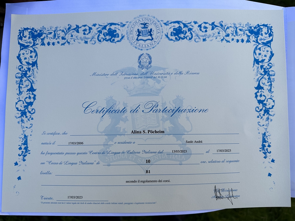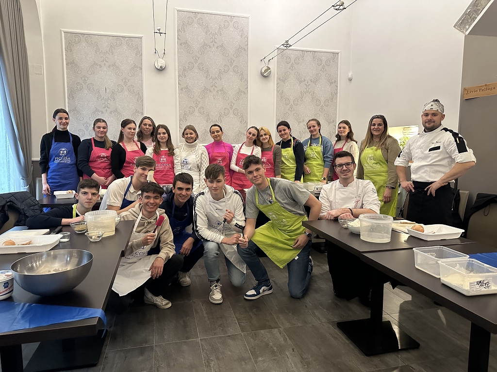 Am Dienstag besichtigten wir das „Castello di Miramare“ und einige Details über die österreichische Habsburgermonarchie wurde uns bei einer Führung durch das Schloss näher gebracht. Die Kulinarik kam natürlich auch nicht zu kurz: Sogar Kocherfahrung konnten wir bei einem gemeinsamen Kochkurs sammeln, in dessen Rahmen wir am Mittwoch unser eigenes Abendessen zubereiteten: „Pasta all´ amatriciana“ – „molto gustoso“! Den süßen Abschluss bildete ein selbstgemachtes Tiramisu. Am Donnerstag genossen wir noch einmal, nach einem 1000- stufigen Rundgang in der größten Grotte der Welt, der „Grotta Gigante“, die wunderschöne Aussicht über Triest vom „Monte Grisa“ aus und ließen den Abend in geselliger Runde ausklingen. Am Freitag hatten wir die letzten Unterrichtsstunden und anschließend folgte die Übergabe der Zertifikate. Danach traten wir die Heimreise an und glichen - eventuellen - Schlafmangel während der Busfahrt aus. Auf dem Weg nach Österreich legten wir noch einen eineinhalbstündigen Stop in Palmanova ein, um Shopping-Gelüste befriedigen und einen Snack konsumieren zu können.