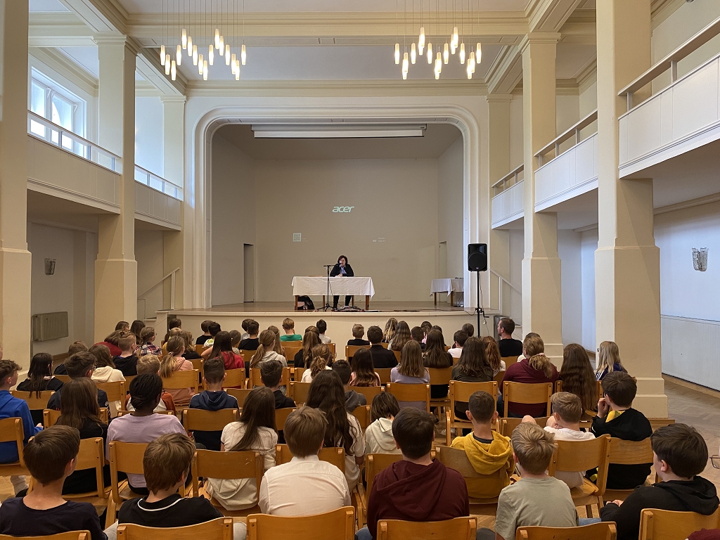 In der ersten Leseeinheit holte sie die gebannten SchülerInnen als Ermittlungsgehilfen der Churchis in das Geschehen des Jugendkrimis, der Mini-Workshop am Ende sorgte für äußerst lebhafte Szenen im Publikum. In der zweiten Einheit las die Autorin aus ihrem jüngsten Buch Risk and Run, das sich mit Drogenmissbrauch und dessen daraus resultierenden, dramatischen Folgen für Leib und Leben auseinandersetzt. Die Autorin dokumentierte in drastischen Bildern die Folgen der Designerdroge Crystal Meth, einer Droge, bei der das Einstiegsalter durchschnittlich im Alter von 12 Jahren liege.