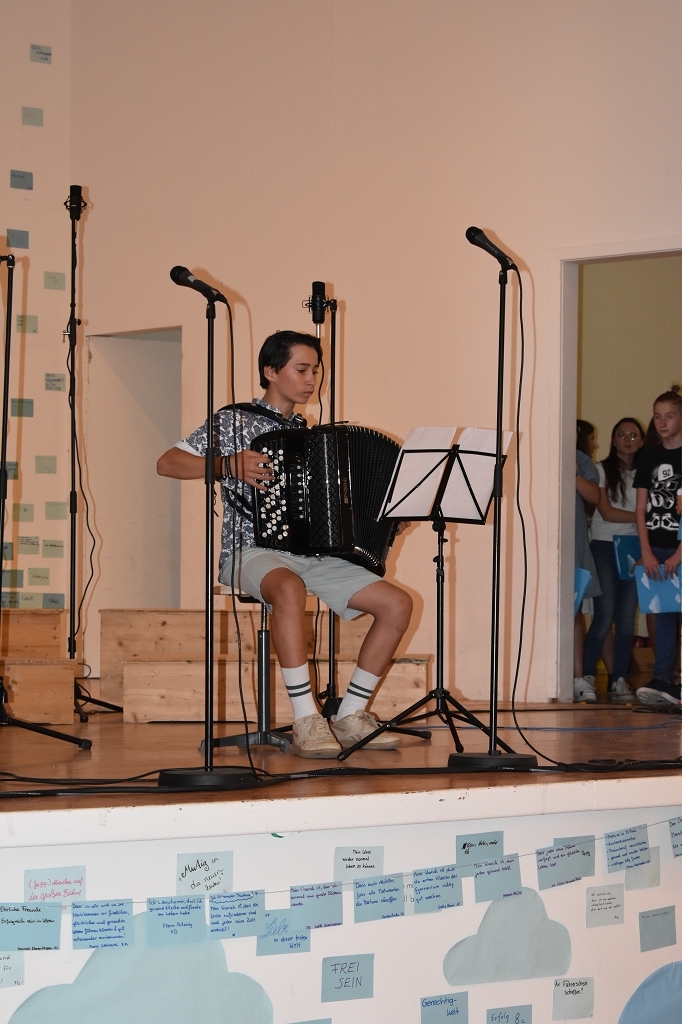 Ergänzt wurde das Programm durch Darbietungen der Prima la musica – Preisträger Samuel Novak, 3A (Landeswettbewerb – Akkordeon) und Clemens Hinteregger, 2B (Landes- und Bundeswettbewerb – Trompete), der am Klavier von Frau Margit Gastrager begleitet wurde.