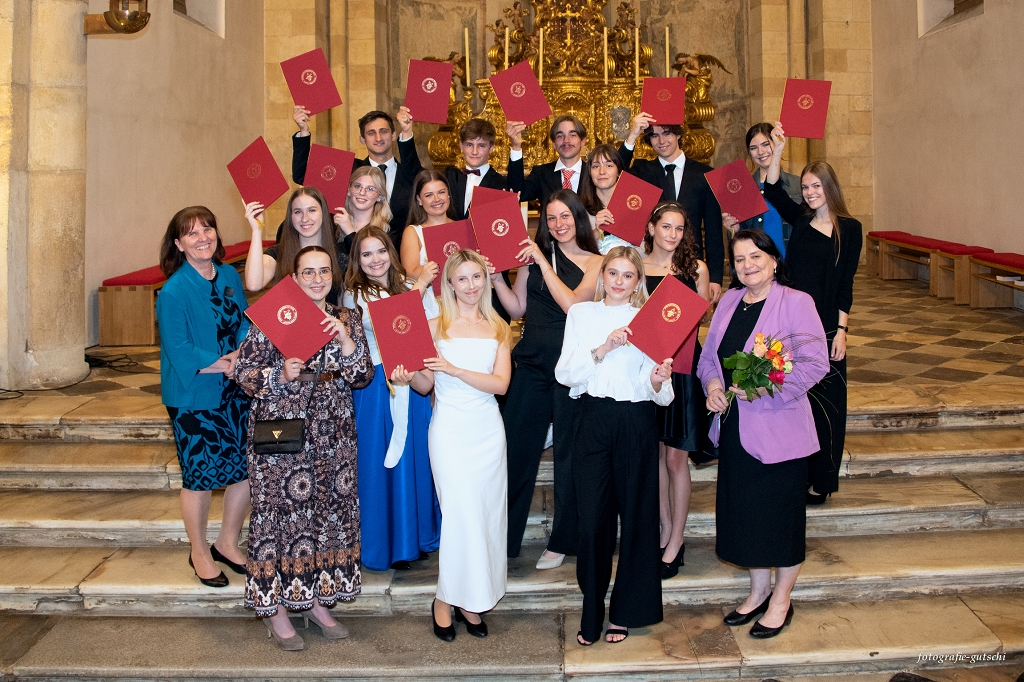 Musikalisch umrahmt wurde die Feier vom Bläserensemble des Stiftsgymnasiums unter der Leitung von Prof. Thomas Zdravja, dem Schulchor unter Prof. Mag. Almuth Wakonig-Dalton mit Unterstützung aus dem Lehrerkollegium und den Solistinnen Dorothee Breidler und Theresa Edelsbrunner.