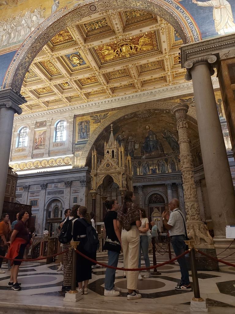 Am fünften Tag in der “Ewigen Stadt” machten wir uns auf den Weg, um früh genug am Petersplatz zu sein, wo wir die Ehre hatten, uns eine Papstaudienz ansehen zu dürfen. Das Stiftsgymnasium wurde aufgerufen, leider konnten wir unsere mitgebrachte Flagge aber nicht in die Kamera halten, da wir noch in der Schlange für die Sicherheitskontrolle standen. Nach einer Mittagspause machten wir uns mit dem Bus auf den Weg zu den San Sebastiano-Katakomben, wo wir durch eine interessante Führung wieder viel Neues lernten. Die letzte Sehenswürdigkeit des Tages, bevor wir unser Abendprogramm wieder selbst gestalten durften, war die Papstbasilika St. Paul vor den Mauern, wo wir wieder durch ein Referat neue Informationen dazulernten und die Porträts aller bisherigen Päpste betrachten konnten.