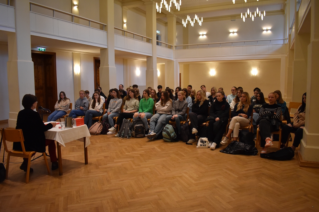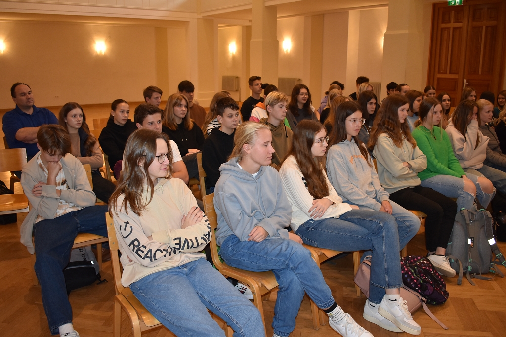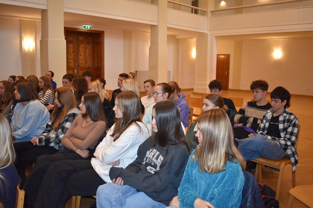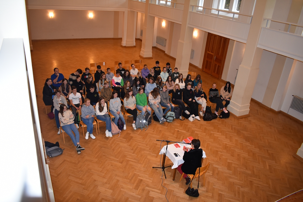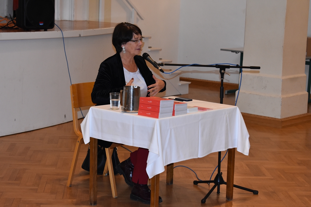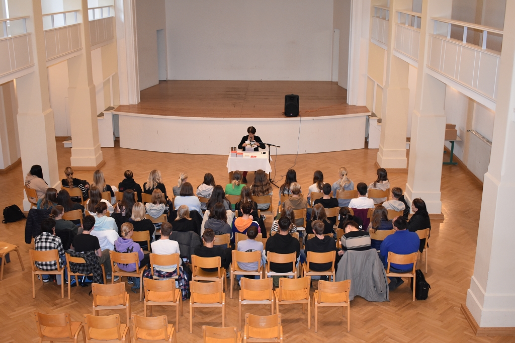 Sie stellte den Schüler:innen der 5. Klassen ihr neu erschienenes Buch “Lavanttal Storys” vor und las einige Anekdoten und Textpassagen aus diesem. Dabei ließ sie die Schüler:innen bestimmte Textstellen aussuchen, die diese besonders interessierten und erzählte einige im Buch enthaltene Berichte von ehemaligen Schülern des Gymnasiums. Die Geschichte kam natürlich auch nicht zu kurz und so erlaubte sie den Schüler:innen und Lehrer:innen, in die Chronik des Stiftes und damit einhergehend des Stiftsgymnasiums einzutauchen. Außerdem gab sie Aufschluss über Beweggründe, das Buch zu schreiben. Die Schüler:innen hörten ihr aufmerksam zu und konnten definitiv ein paar neue Dinge über das Lavanttal lernen.