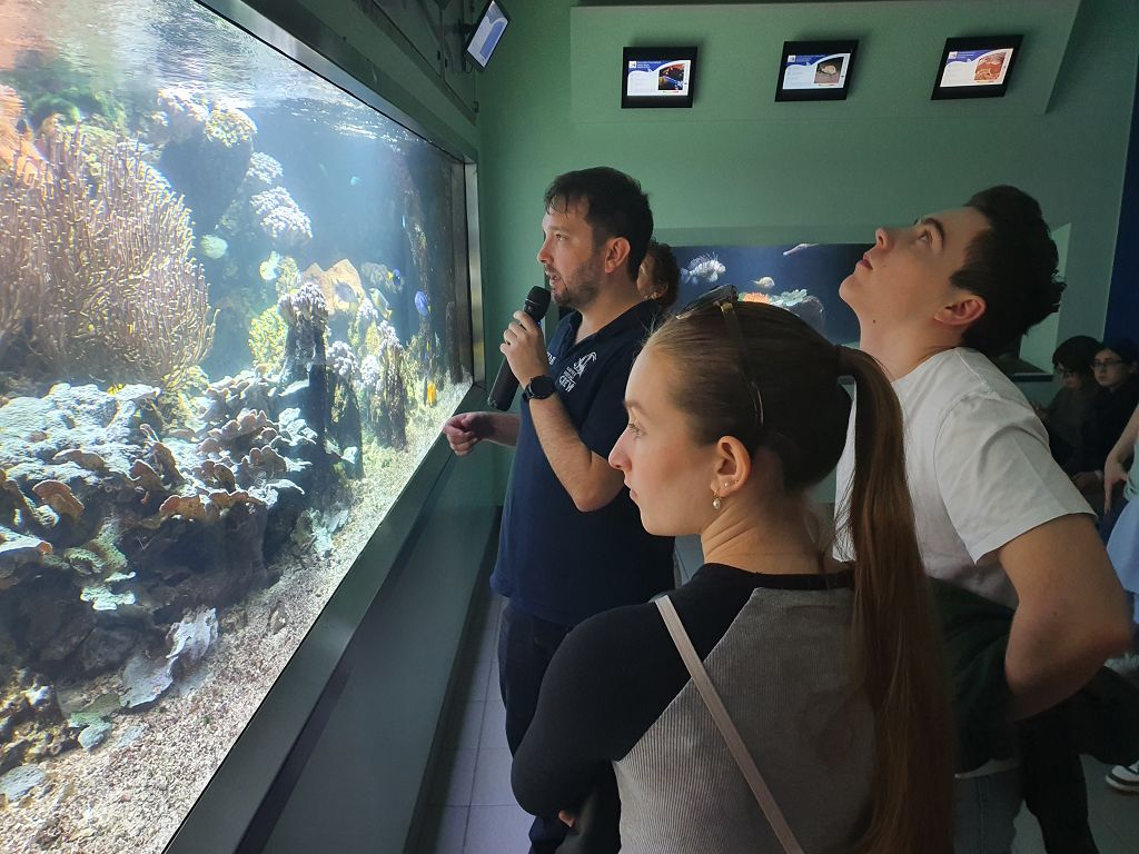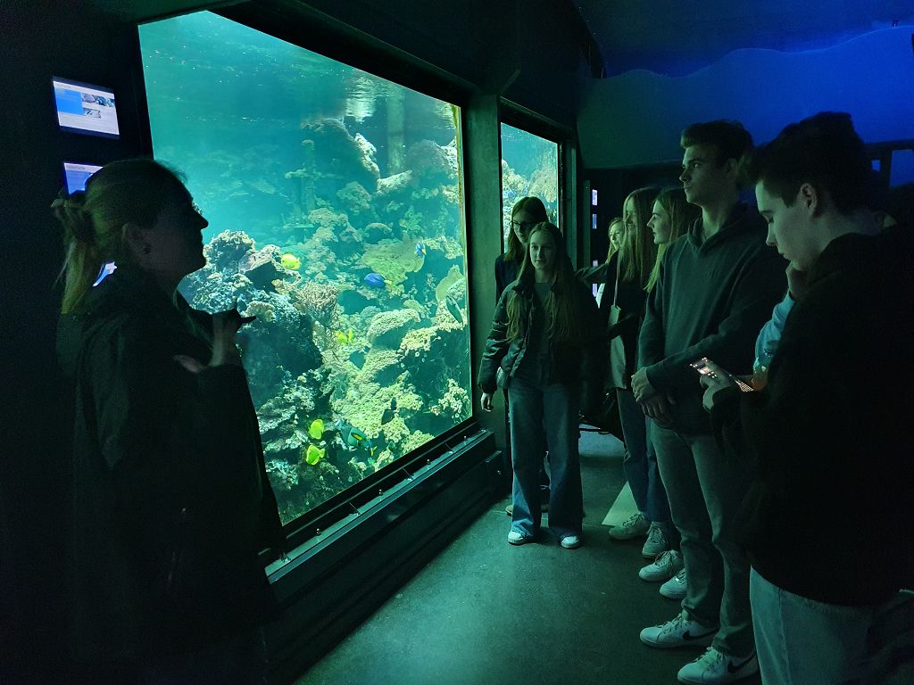 Am nächsten Morgen, nach dem Frühstück im Hotel, begaben wir uns zum Haus des Meeres, das über 10 Stockwerke, eine Aussichtsplattform und ein Dachrestaurant verfügt. Auch hier wurden wir von unserem Guide herzlich empfangen, der uns spannende Einblicke in die Welt der Knorpelfische gab. Zu diesen gehören Haie, Rochen und andere Arten. Wir bewunderten ein Haigebiss und verschiedene Haifischeier, bevor uns unser Guide durch die verschiedenen Stockwerke führte und uns die Besonderheiten verschiedener Meeresbewohner zeigte. Besonders fesselnd war die Lebensgeschichte der Meeresschildkröte Puppi, welche die berühmteste Bewohnerin des Hauses ist und das Haifischbecken fest im Griff hat. Unsere offizielle Führung endete bei den Mittelmeeraquarien, doch Herr Prof. Sapper führte uns noch durch den Aquarium-Tunnel und zum Hammerhaibecken. Danach hatten wir Zeit die anderen Stockwerke individuell zu erkunden, bevor wir die Aussichtsplattform besuchten, von der aus wir einen atemberaubenden Blick über Wien hatten.