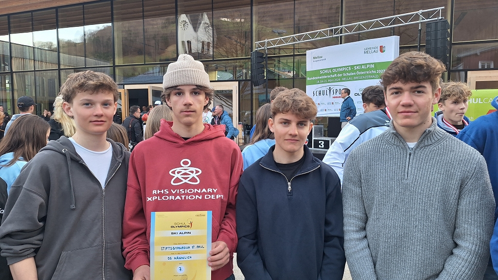 Nachdem die schnellsten drei Zeiten pro Rennen jedes Bundeslandes addiert wurden, konnten sich die Lokalmatadore aus Vorarlberg bei der Siegerehrung am Dorfplatz über den Platz ganz oben am Stockerl freuen, während sich die Schifahrer des Stiftsgymnasiums St. Paul (Bewerb Oberstufe männlich) mit dem 7. Platz zufrieden gaben. Jakob Wuggenig verzeichnete im Riesentorlauf die fünftschnellste Einzelzeit und am Mittwoch gar die drittschnellste. Mit dem Wissen, dass in der Teamwertung auf die Plätze 5 und 6 nur wenige Zehntel gefehlt hätten, war man trotzdem eine tolle Erfahrung reicher und stolz darauf, zu den besten Schifahrern Österreichs zu gehören. Ein besonderes Highlight war bestimmt das Freifahren nach den Rennen, währenddessen man vor allem das prächtige Frühlingswetter genießen und gleichzeitig die herrliche Winterlandschaft im weitläufigen Schigebiet Mellau-Damüls-Faschina erkunden konnte.