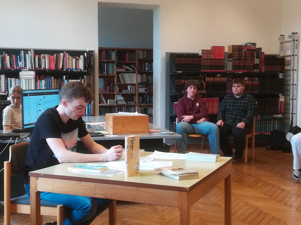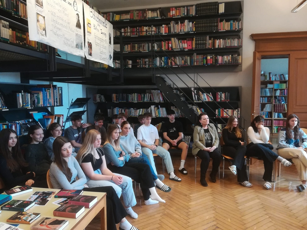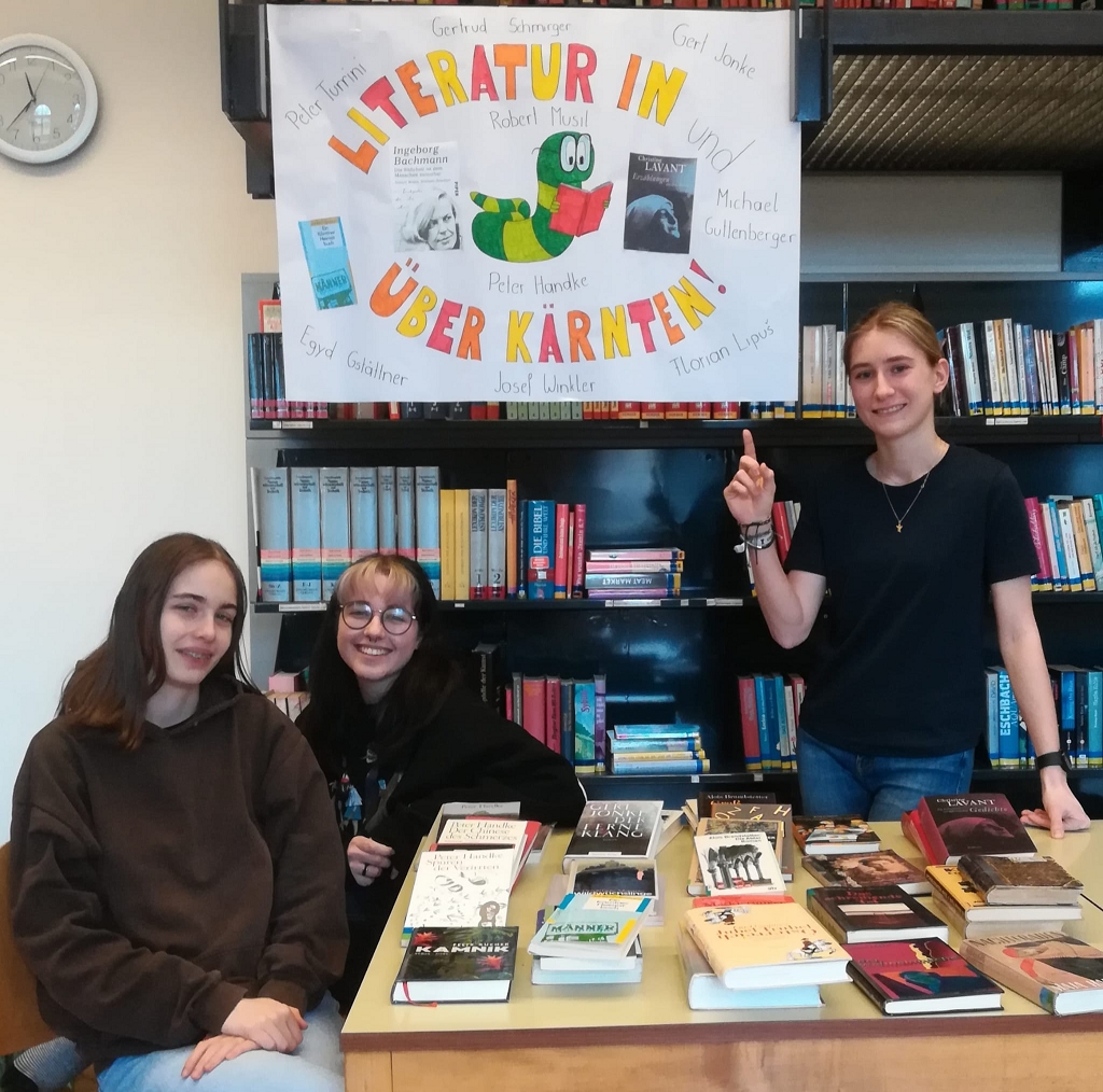 Zu den Lesungen der Oberstufe versammelten sich die Schüler klassenweise in der Bibliothek, wo von der ersten bis zur sechsten Stunde Hochbetrieb herrschte. Die Vor-Lesungen standen unter dem Thema „Literatur in und über Kärnten“. Zwei Vorleseteams versorgten das jeweilige Auditorium mit Kurztexten von Janko Messner und Egyd Gstättner, Schriftstellern, die vom Schulbibliothekar exemplarisch aus der Vielzahl möglicher Kandidat:innen ausgesucht worden waren. Den beiden Leseteams, bestehend aus Schülern der 8b, 7c und 6b, ist es gut gelungen, spezifische Themen und Stoffe der Kärntner Literatur zu transportieren. Die Besucher konnten sich auch an einer Ausstellung von bibliothekseigenen Büchern von Kärntner Autor:innen erfreuen, die die Buntheit und Vielfalt des literarischen Schaffens in Kärnten abbildet. Das ansprechende Poster dazu stammte von Sandra Dohr (8b).