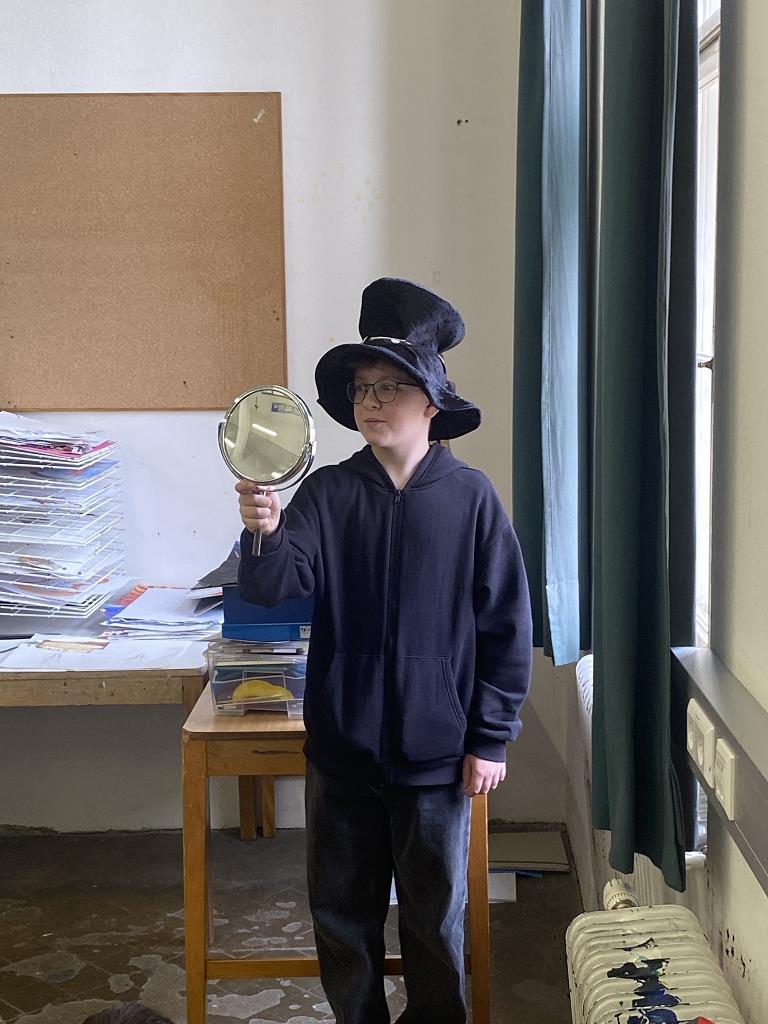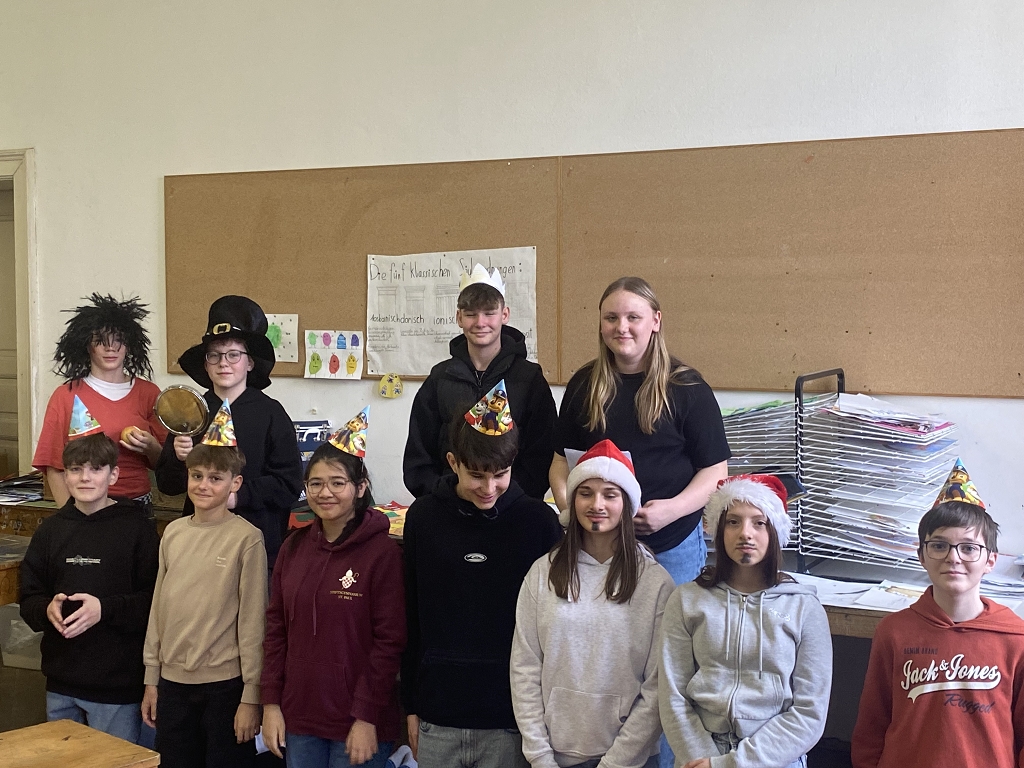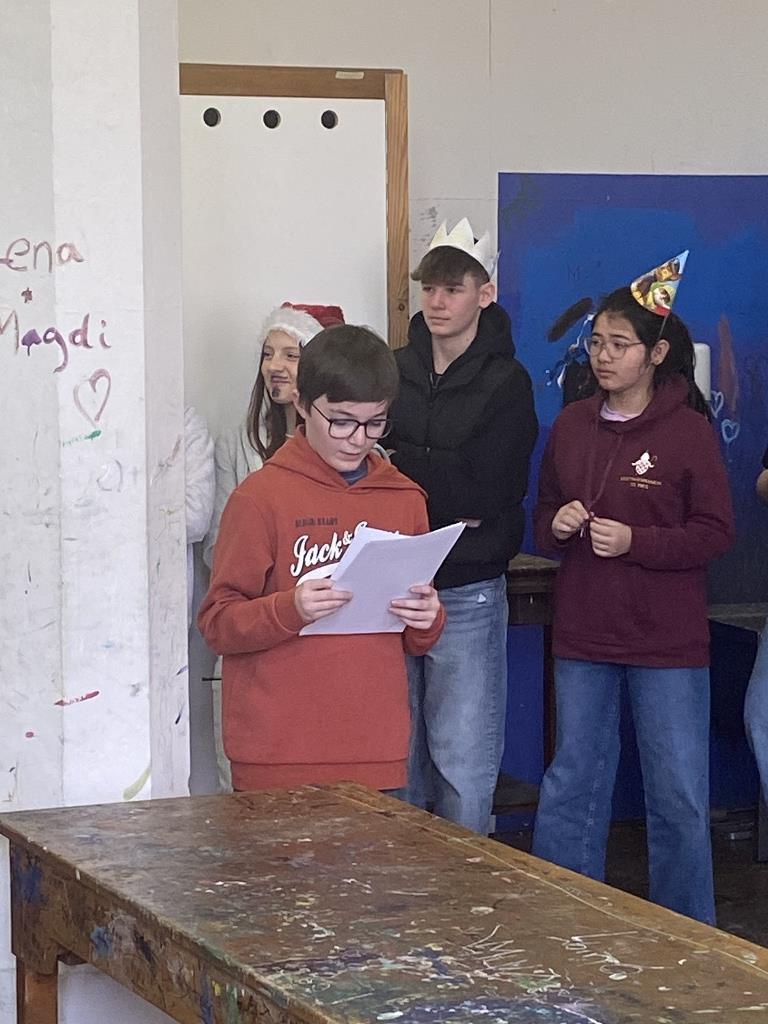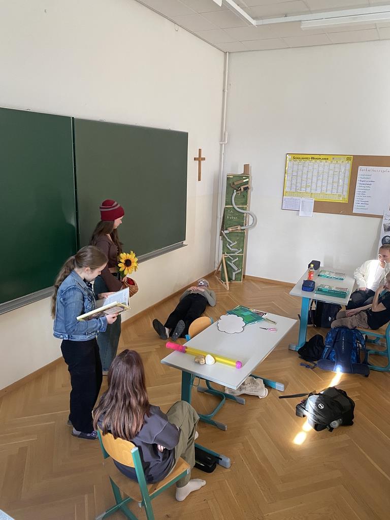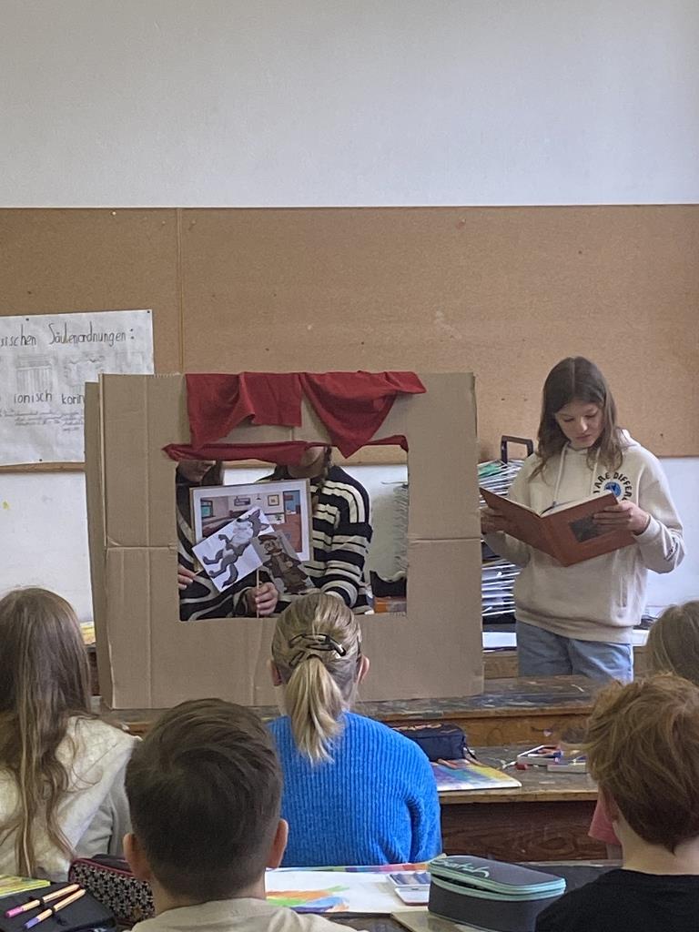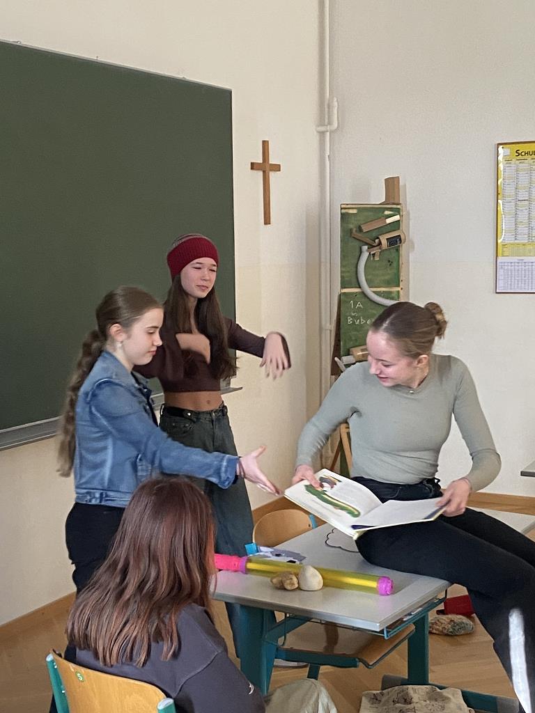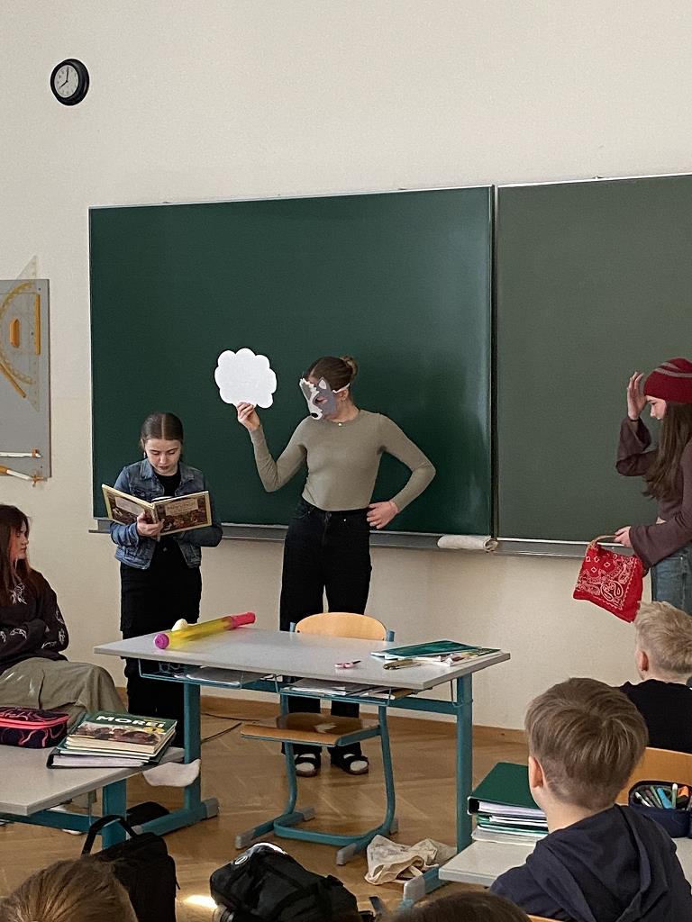 In der Unterstufe haben die Deutsch-Professor:innen der vierten und dritten Klassen individuelle Lesepakete für die Erst- und Zweitklassler zusammengestellt. Die dritten Klassen bereiteten für die ersten Klassen verschiedene Märchen vor. Es wurde aber nicht nur vorgelesen. Auch für das Auge war etwas dabei, denn die Schüler:innen integrierten das Vorlesen in Theaterstücke. Verschiedene Requisten und Kostüme wurden gebastelt und hergestellt. Eine Gruppe bereitete sogar ein Puppentheater für die Erstklässler vor. Mit viel Liebe zum Detail entstanden wunderbare Szenen, die die Schüler:innen der ersten Klassen begeisterten. Auch die „Großen“ hatten Freude daran, den Erstklässlern die Ergebnisse ihrer Arbeit zu präsentieren. Die vierten Klassen beschäftigen sich mit verschiedenen Balladen, die sie den Schüler:innen der zweiten Klassen näherbrachten. Einzelne Szenen wurden ebenso von den Viertklässlern nachgespielt, was das Verständnis des oft schwierigen Inhalts der Texte erleichtern sollte.
