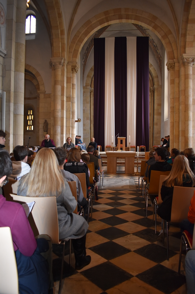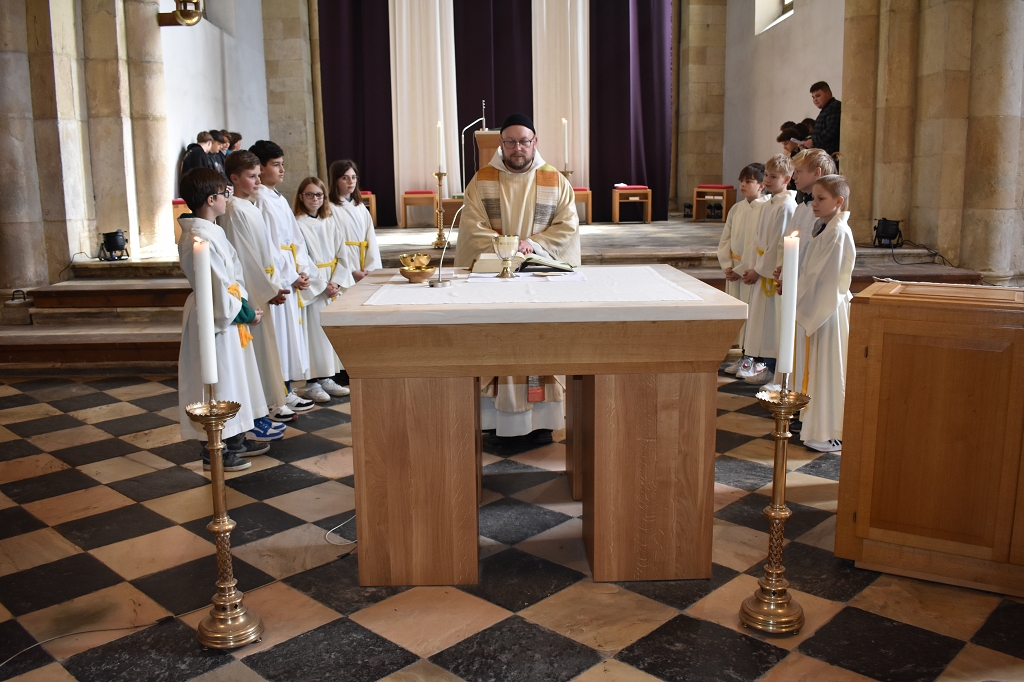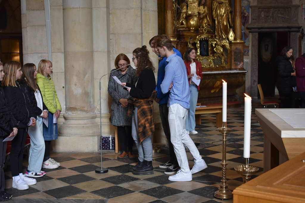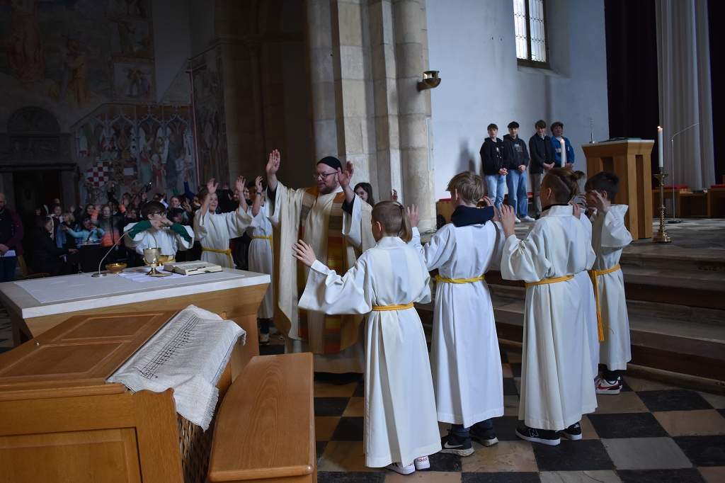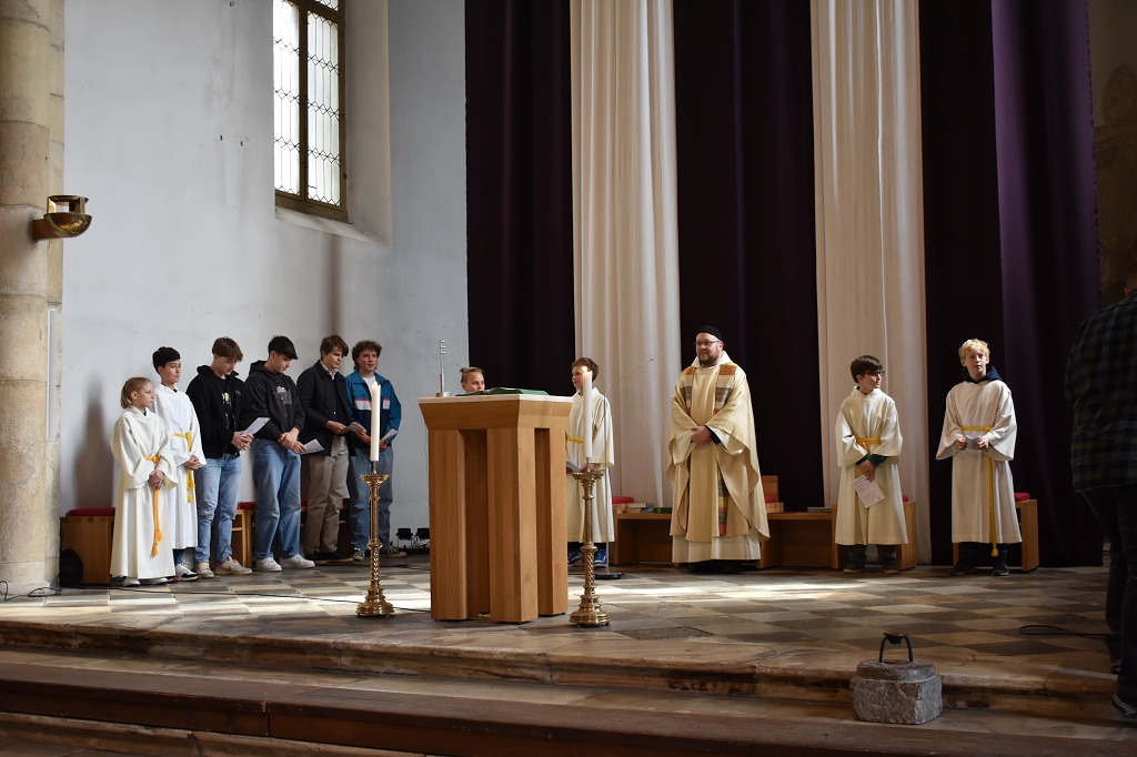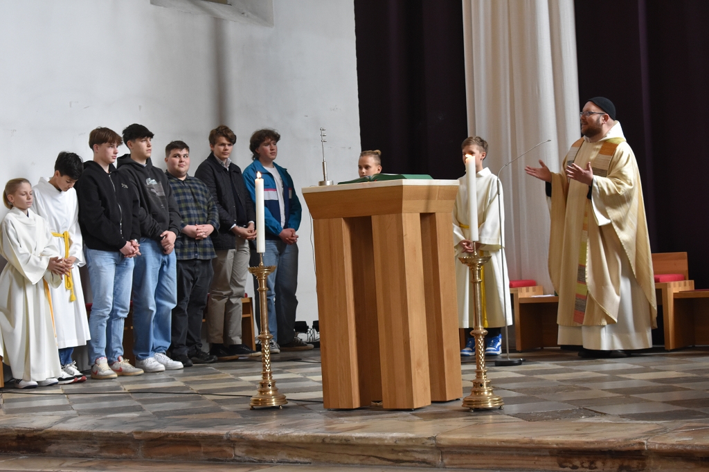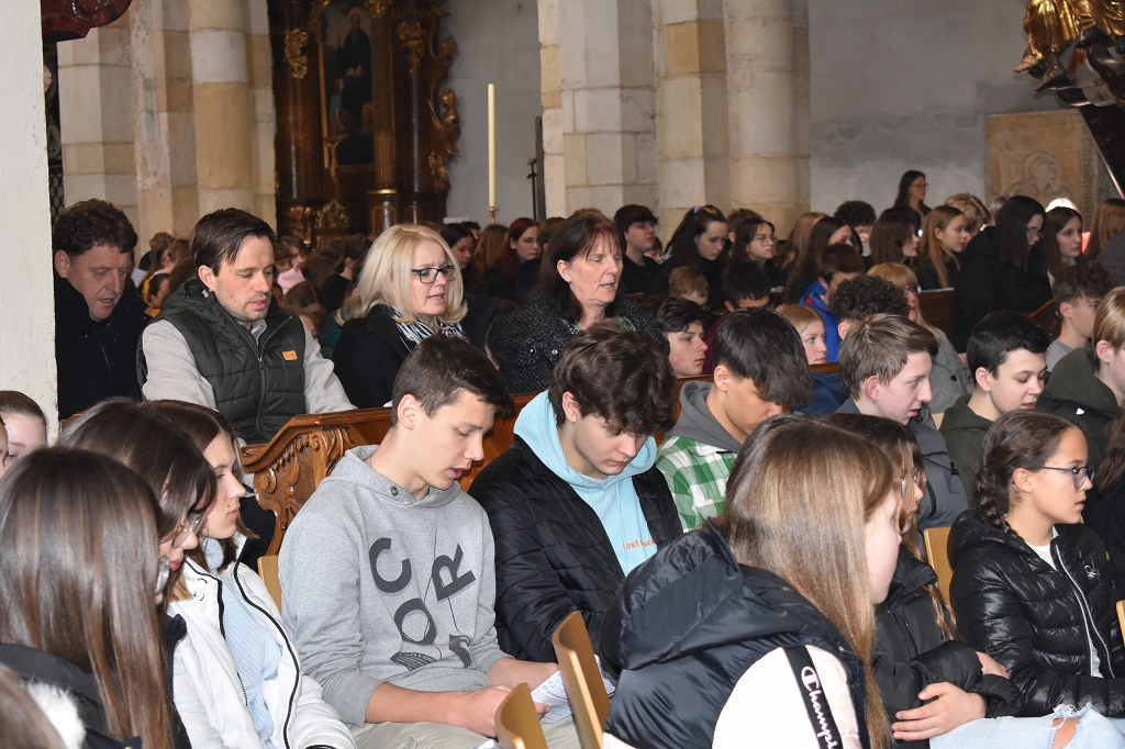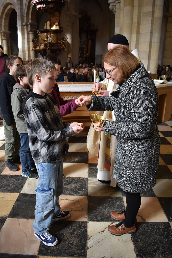 Auch dieses Jahr fand am 22.03.2024 die vorösterliche Messe vor dem Beginn der Osterferien statt. Zentrales Thema des Gottesdienstes war das Doppelgebot der Nächstenliebe (Mk 12, 29-31), welches sich als Leitgedanke durch die Fastenzeit gezogen hatte. Für die Feier der heiligen Messe danken wir Provisor Mag. Pater Marian Kollmann, der in einer lebhaften Predigt das Gebot der Nächstenliebe anschaulich erklärte und erläuterte, dass „Feinde“ zu lieben, auch heißen kann, seinen Nächsten nicht im nächsten Teich zu versenken – der Versuchung, den leichteren Weg zu gehen, zu widerstehen, da die Liebe es fordert, den Kelch zu nehmen, der einem von Gott gegeben wurde.