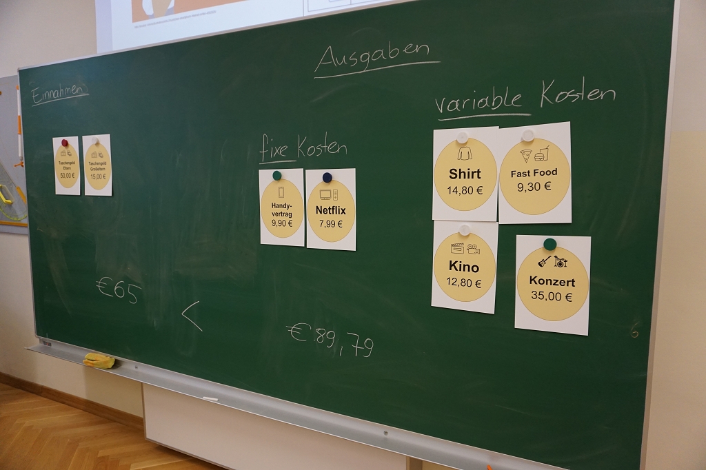 Uns wurde nähergebracht, wie man richtig spart und dass es wichtig ist, sein Geld ordentlich zu verwalten. So wurde die App ,,M€ins“ beworben, mit der man online ein so genanntes „Haushaltsbuch“ führen kann. Ein Haushaltsbuch dient dazu, sich seine Ausgaben und Einnahmen bewusst zu machen. Außerdem wurde uns der Unterschied zwischen fixen und variablen Kosten erklärt.