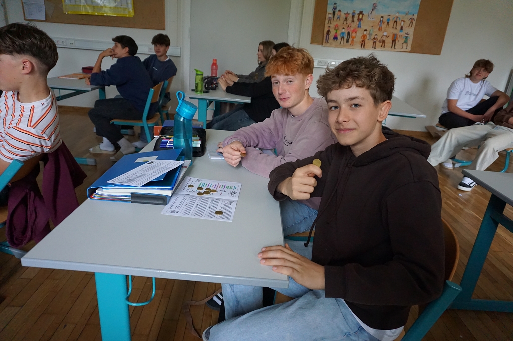 Im zweiten Workshop, genannt ,,Der Weg des Geldes“, haben die Schüler*innen der 4. Klassen viel Wissenswertes über den Lauf des Geldes gelernt. Außerdem wurde erklärt, dass früher nicht mit einer offiziellen Währung gezahlt wurde, sondern Objekte – wie zum Beispiel Kühe, Steine, Muscheln – als Zahlungsmittel dienten. Diese Objekte müssen aber gewisse Kriterien erfüllen. Beispielsweise müssen sie den Wert halten.