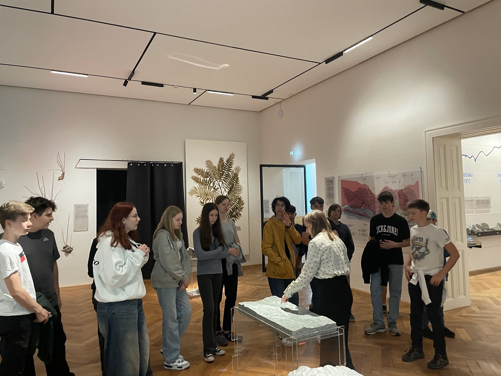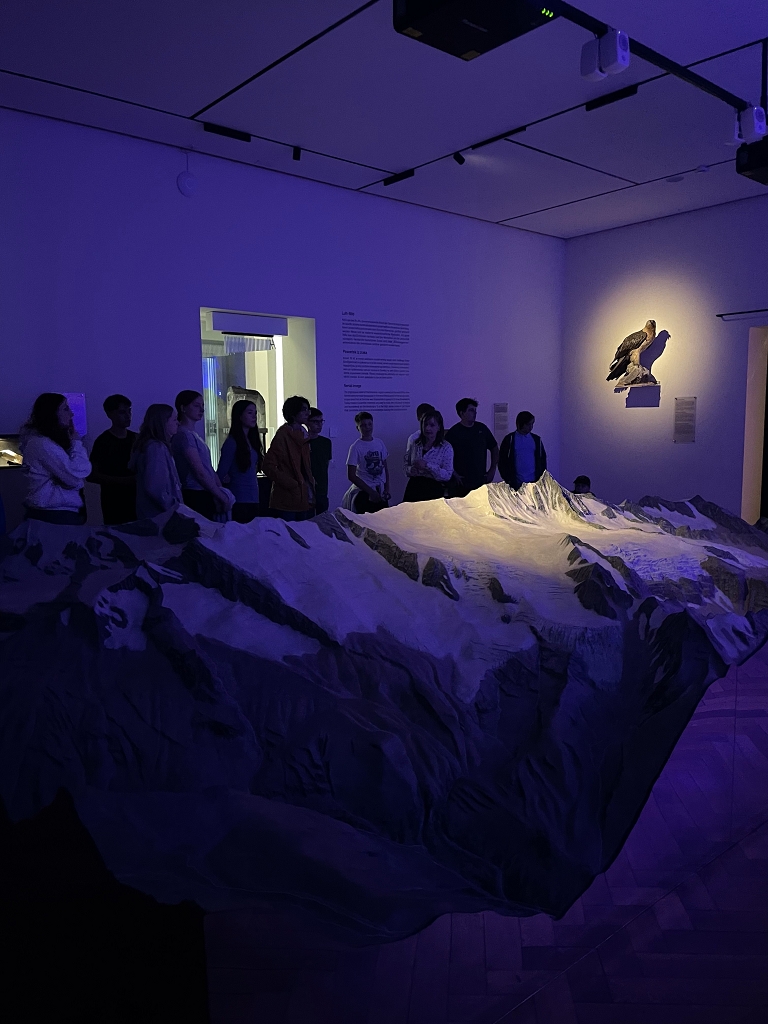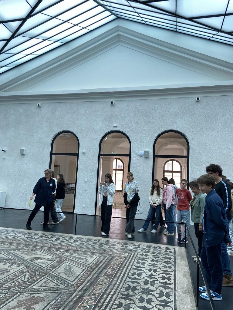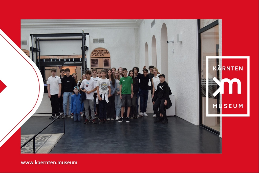 In Klagenfurt angekommen, ließ die Sonne leider auch auf sich warten. Nichtsdestotrotz ging es bewaffnet mit Regenschirmen nach der Mittagspause in den City Arkaden weiter zum neueröffneten kärnten.museum. Im Rahmen einer umfassenden Führung trafen die Schüler*innen unter anderem auf den „Lindwurmschädel“, das Großglockner-Relief sowie das faszinierende Dionysos-Mosaik aus Virunum.