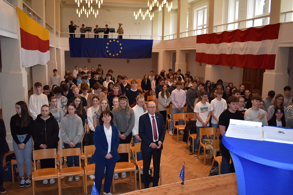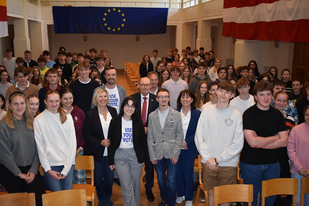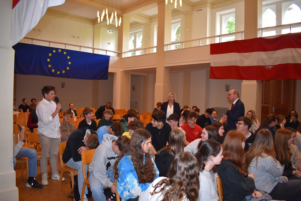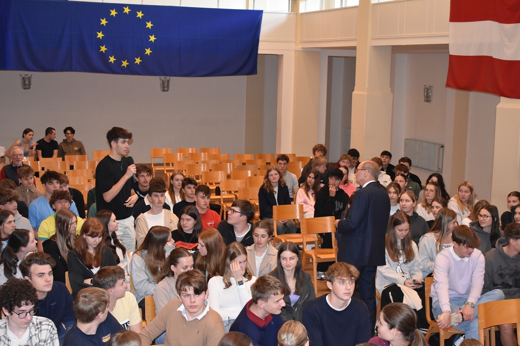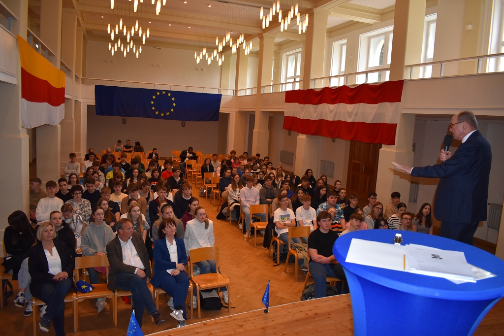 Nach der herzlichen Begrüßung durch Direktorin Mag. Ines Leschirnig-Reichel gab Dr. Othmar Karas spannende Einblicke in seinen politischen Werdegang, der als Klassensprecher in Niederösterreich begann. Als überzeugter Europäer beleuchtete er die vielfältigen Aufgaben des Europäischen Parlaments.