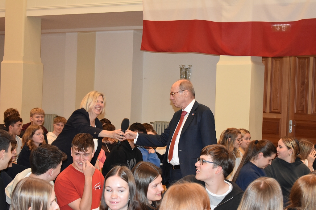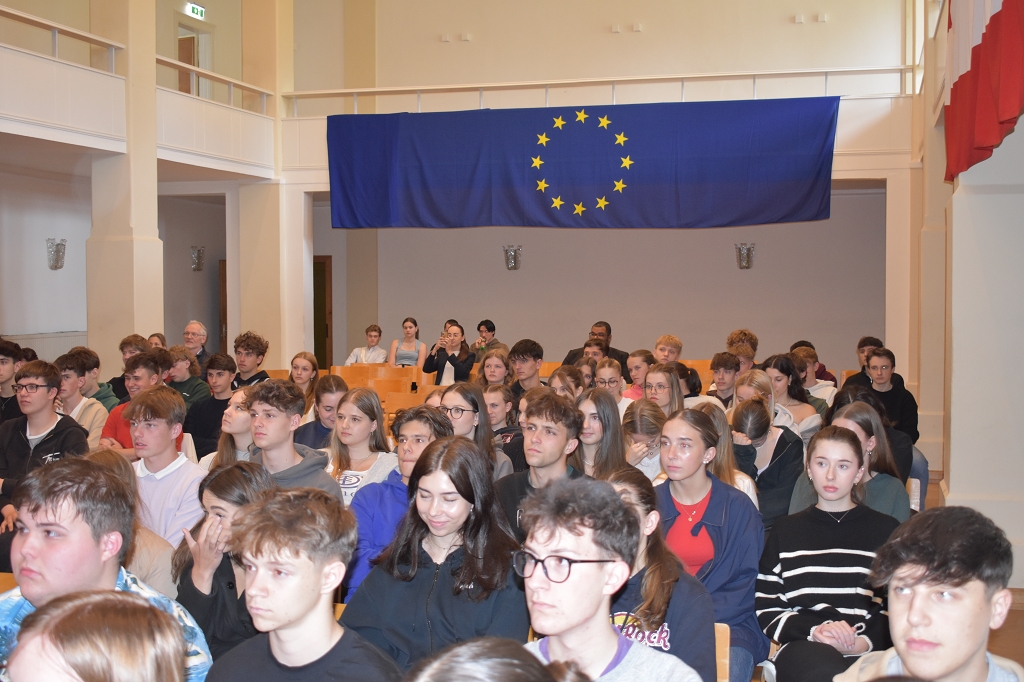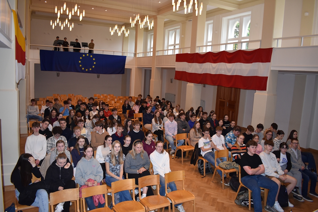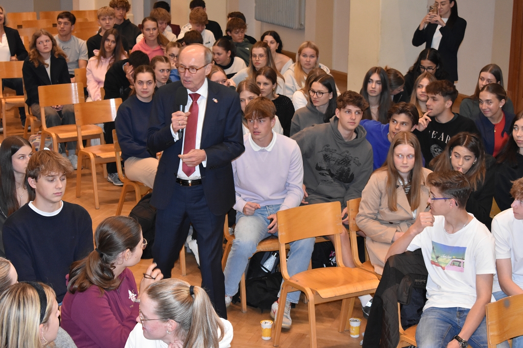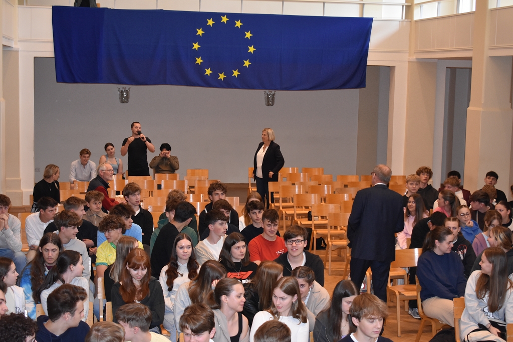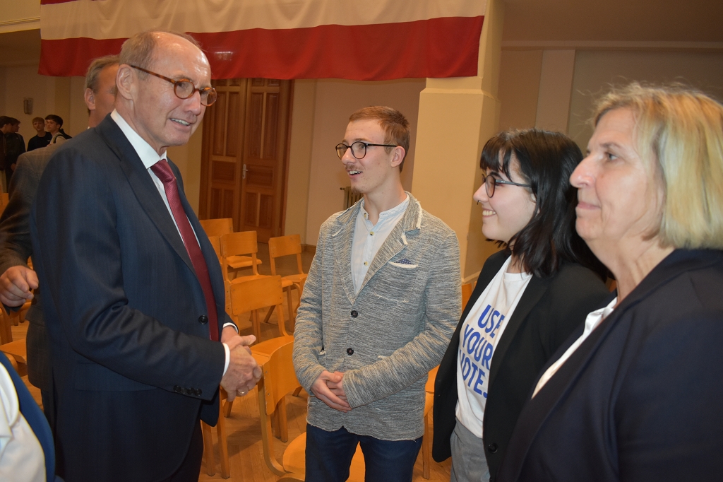 Nach der herzlichen Begrüßung durch Direktorin Mag. Ines Leschirnig-Reichel gab Dr. Othmar Karas spannende Einblicke in seinen politischen Werdegang, der als Klassensprecher in Niederösterreich begann. Als überzeugter Europäer beleuchtete er die vielfältigen Aufgaben des Europäischen Parlaments.