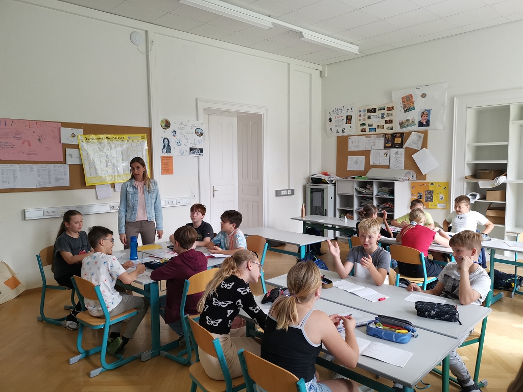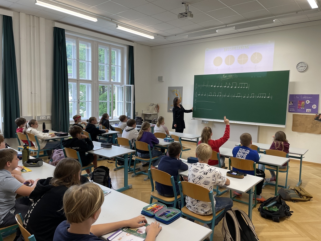 Auch zwischen Rhythmus und Mathematik besteht ein enger Zusammenhang, denn die Musik folgt einem regelmäßigen Puls, der in Takte unterteilt ist. Die Abfolge von leichten und schweren Schlägen bestimmt verschiedene Taktarten. Mithilfe eines popigen Musikstückes konnten die Schülerinnen und Schüler der 1B-Klasse verschiedene Rythmen in Bewegung umsetzen und somit die Noten- und Pausenwerte praktisch anwenden.