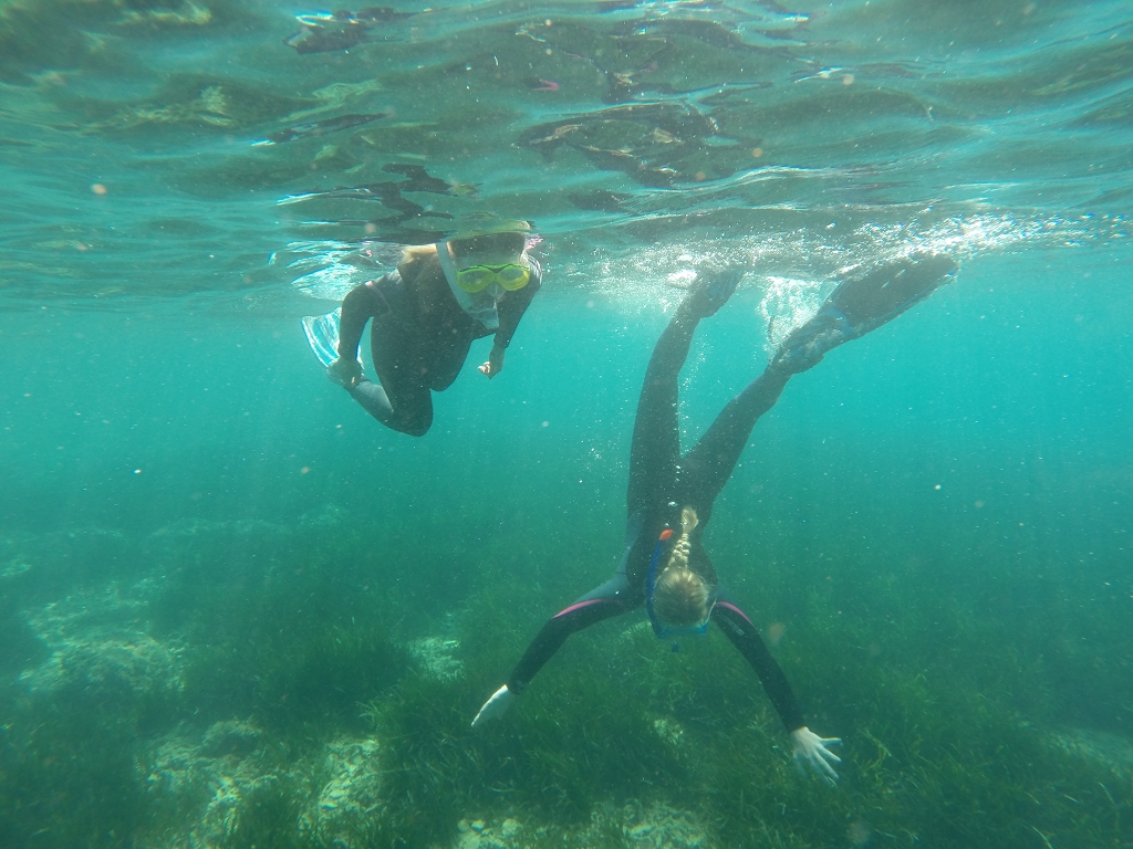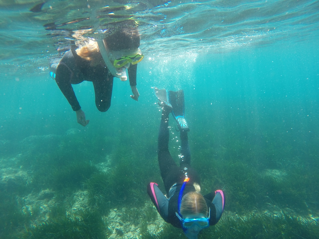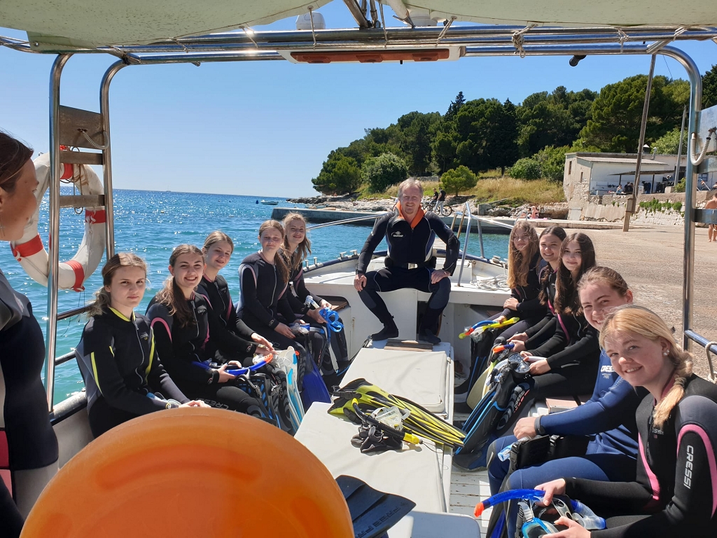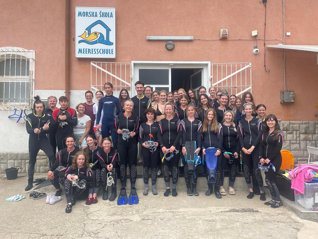 Aus synergetischen und ökologischen Gründen reisten außerdem SchülerInnen der BAFEP Klagenfurt mit. Begleitet wurden die Gruppe von den Professoren Dr. Norbert Sapper, Mag. Patrick Riedner, Mag. Bettina Pesec, Mag. Johanna Reiner und Mag. Manuel Herko. Die Anreisen erfolgten mit dem Busunternehmen Juwan und gleich am ersten Tag durften die SchülerInnen in der Meeresschule von Pula erste Schnorchelerfahrungen sammeln. In den darauffolgenden Tagen wurde die Obere Adria sowohl in der Theorie als auch in der Praxis erforscht. Unter fachkundiger Anleitung sammelten sie verschiedene Meeresbewohner, wie Garnelen, Seeigel und Seespinnen, die sie danach im Labor beobachten konnten, anschließend jedoch wieder ins Meer freiließen. Auch kleinstes Plankton fingen die Biologie-Begeisterten mit einem Kescher aus dem türkis-blauen Meereswasser. Zudem machte die Schülergruppe einen Bootsausflug zu einer idyllischen Bucht mit Seegras und in einen Canyon, wo sie die Vielfalt unter Wasser erforschen konnten. Das Abendprogramm führte ebenso auf das Meer hinaus, wo sie vom Boot aus Delfine in unmittelbarer Nähe erblickten sowie den traumhaften Sonnenuntergang genießen konnten. Alles in allem konnten die Schülerinnen und Schüler unvergessliche Erfahrungen sammeln und ihr Wissen durch diese meeresbiologische Exkursion erweitern.