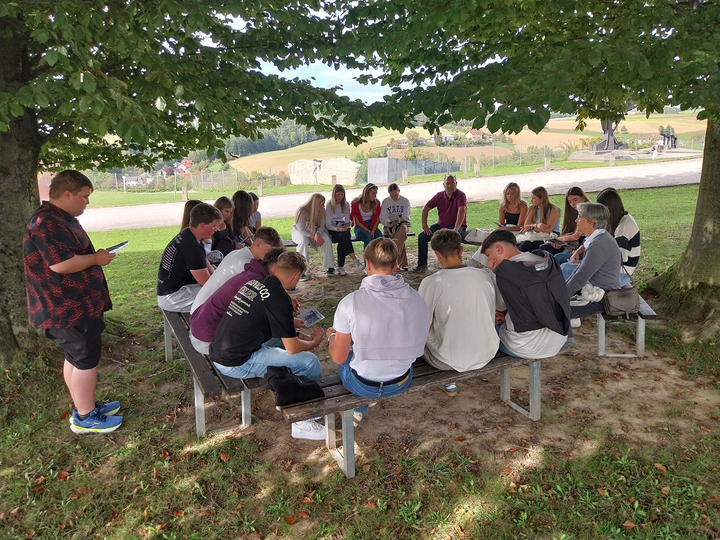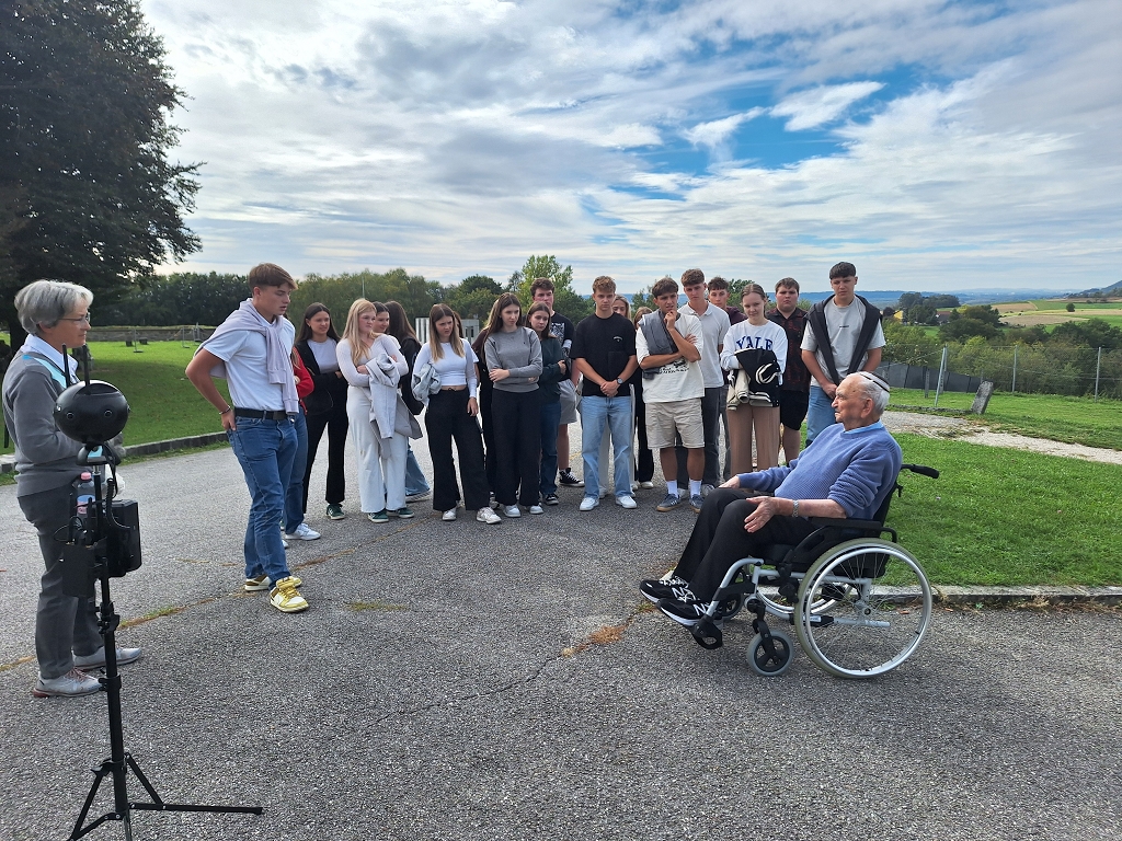 Der Zufall wollte es, dass unsere Auseinandersetzung mit diesen Themen von einer ungeplanten Begegnung ihre größtmögliche Authentizität erfuhr. Beim Park der Denkmäler, dem ehemaligen SS-Lager, traf die 8.a Klasse, zuerst unbedarft und ohne Neugier, auf einen alten Mann im Rollstuhl, der zunächst als einfacher Besucher der Gedenkstätte wahrgenommen wurde. Wie sich rasch zeigte, handelte es sich aber um einen der letzten Überlebenden der KZ-Maschinerie, Avigdor Neumann, über den gerade eine Dokumentation gedreht wurde. Er forderte als einer, der im Alter von 14 Jahren das KZ überlebt hatte und heute als 93-Jähriger in Israel wohnt, die Schüler:innen auf, mit ihm ins Gespräch zu kommen, erzählte in berührender Art über seine Ankunft im KZ Mauthausen / Gunskirchen, seine Erfahrungen mit der herrschenden Gewalt und zeigte uns seine am Unterarm eintätowierte Häftlingsnummer B14665.
