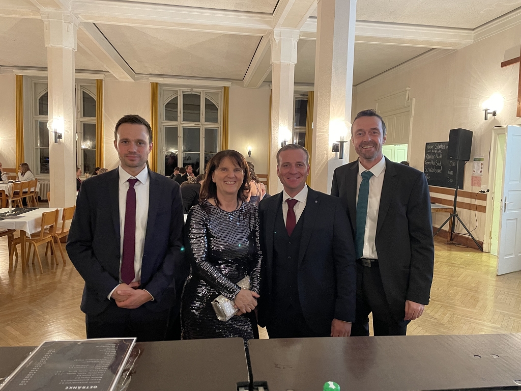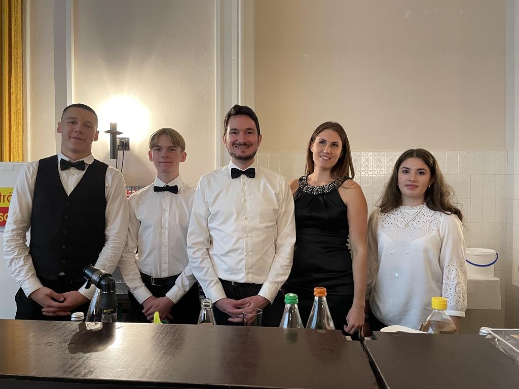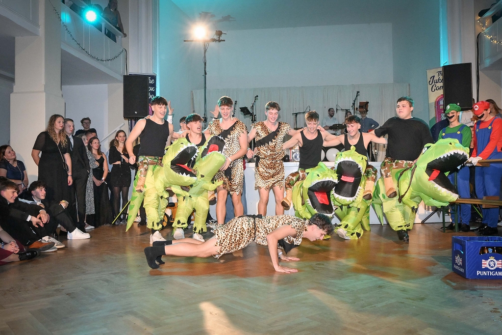 Ein absoluter Höhepunkt des Abends war die spektakuläre Mitternachtseinlage, die die Gäste auf eine rasante Reise durch die Epochen entführte. Begleitet von den Kultfiguren Doc Brown und Morty McFly begann die Zeitreise in der Urzeit, wo sich Dinosaurier und Steinzeitmenschen zunächst bekämpften, um sich schließlich zu versöhnen. In der Antike wurde der Mord an Cäsar inszeniert und endete in einem mitreißenden Tanzkampf mit Doc Brown. Im Mittelalter wurde die Pest kreativ dargestellt, gefolgt von Luthers 95 Thesen, die symbolisch angeschlagen wurden. Schließlich führte die Reise in die wilden 80er Jahre, wo die Gäste in einem energiegeladenen Tanz auf Stars wie Michael Jackson und AC/DC trafen - ein unvergesslicher Abschluss der Mitternachtsshow!