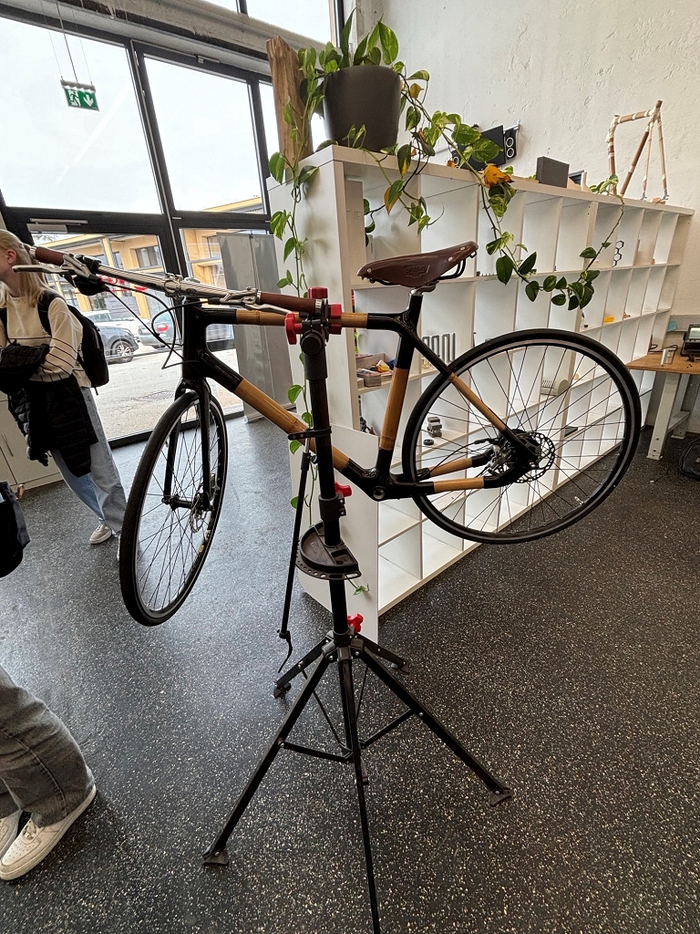 Im Bereich der Softwareentwicklung konnten die Schülerinnen und Schüler beobachten, wie digitale Projekte programmiert und umgesetzt werden können. Ein anderer Teil der Werkstatt wird für künstlerische Projekte genutzt, wobei auch der zur Verfügung gestellte 3D-Drucker zum Einsatz kommt. Als Beispiel stellte Herr Moser ein Bambusfahrrad vor – ein nachhaltiges und kreatives Projekt, das die Möglichkeiten der Werkstatt eindrucksvoll zeigt. Das Bambusfahrrad ist nur eines von vielen Beispielen, wie kreative Ideen dort in die Realität umgesetzt werden können.