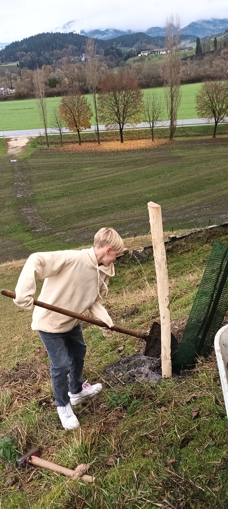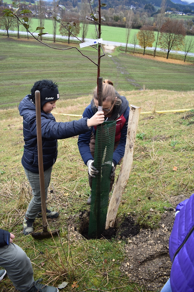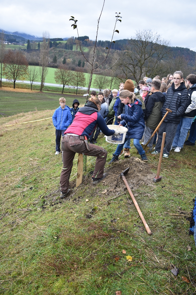 Gesponsert vom Programm „Biotop blühendes Lavanttal“ mit Initiator Mag. Stephan Stückler setzten die Schülerinnen und Schüler der 1b Klasse gemeinsam mit ihren „Paten“ aus der 3c Klasse alte Apfel- und Birnensorten am Stiftshügel. Gepflanzt wurden die Sorten Weiße Pelzbirne, Mostbirne, Achazlbirne, Galloway Pepping und Danzinger Kantapfel. Fachkompetente Unterstützung erhielten sie dabei von der Gärtnerin Ing. Johanna Sternath, die den Schülern wertvolle Kenntnisse über die ökologische Bedeutung von Streuobstwiesen vermittelte.