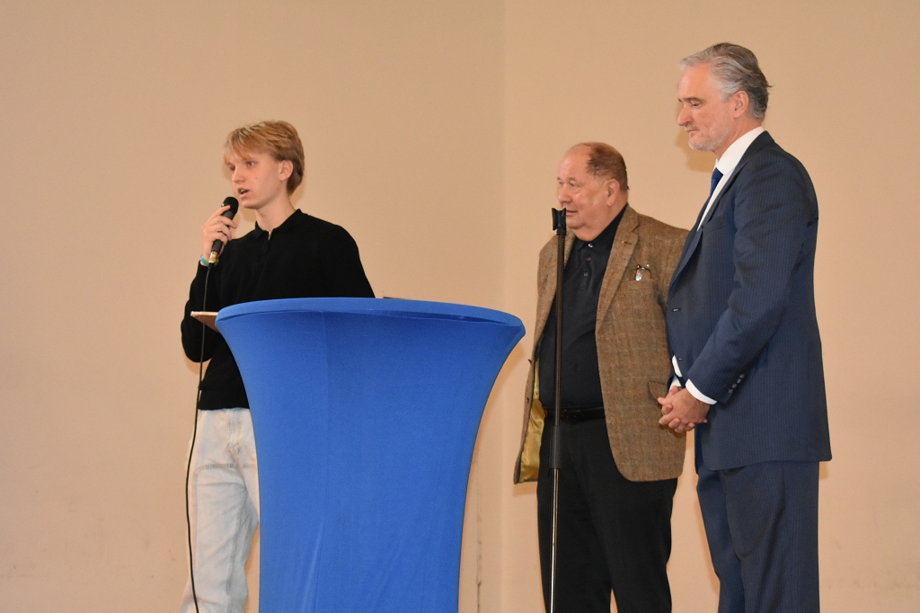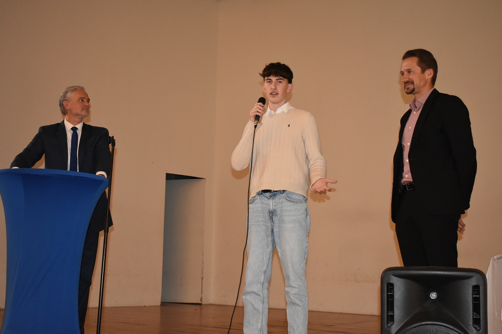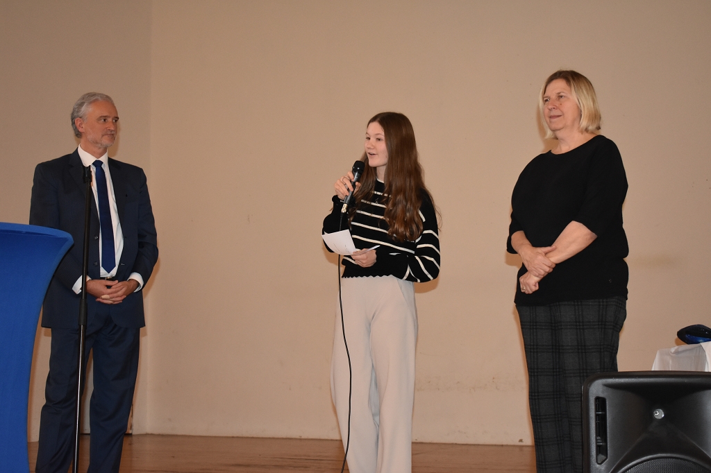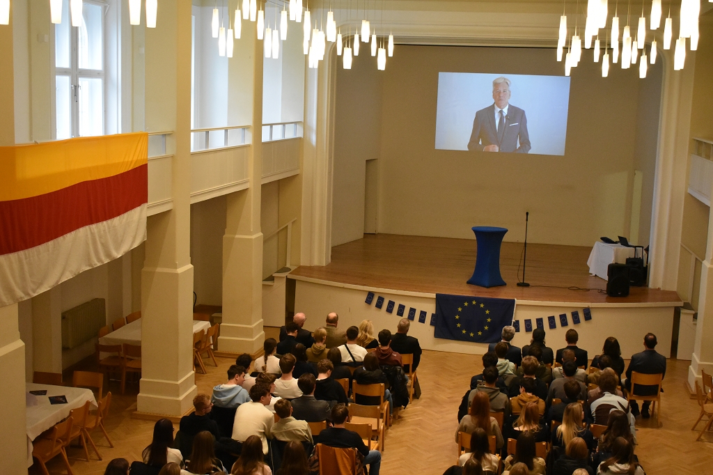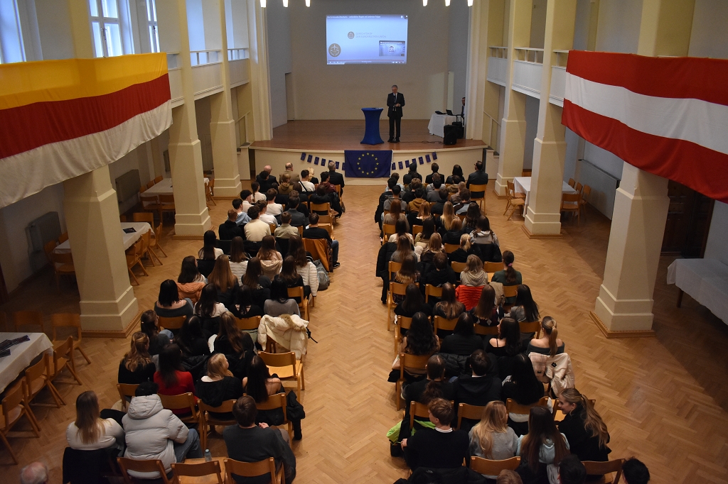 Nach der Europahymne, intoniert vom Bläserquartett der Schule (Andreas Streit 8b, Tobias Streit 5b, Elias Zweytick 7b, Clemens Hinteregger 4b) unter der Leitung von Prof. Thomas Zdravja, eröffnete die Direktorin Mag. Ines Leschirnig-Reichel die Veranstaltung. Im Anschluss an die Grußworte von Bürgermeister Stefan Salzmann und Dr. Christian Gsodam, Europäischer Diplomatischer Dienst, folgte die Videobotschaft des LH Dr. Peter Kaiser. In dieser unterstrich er die Wichtigkeit der europäischen Grundwerte, vor allem der Bildung, und zeigte sich hocherfreut über das Interesse der Jugendlichen an der Thematik.