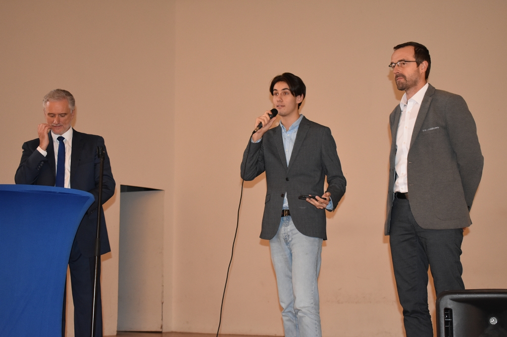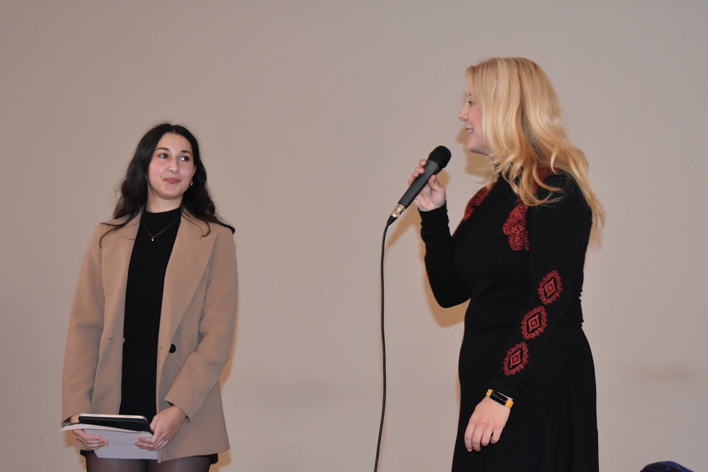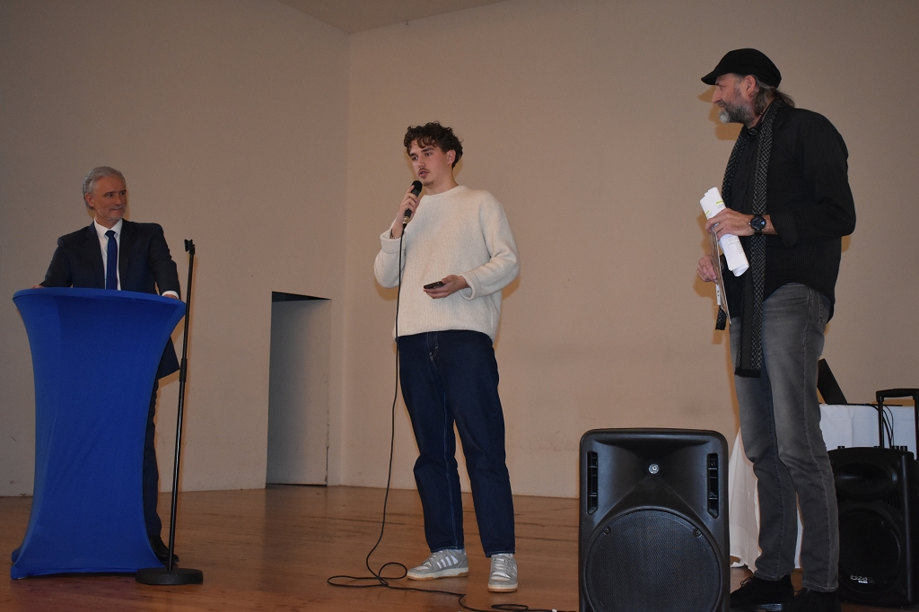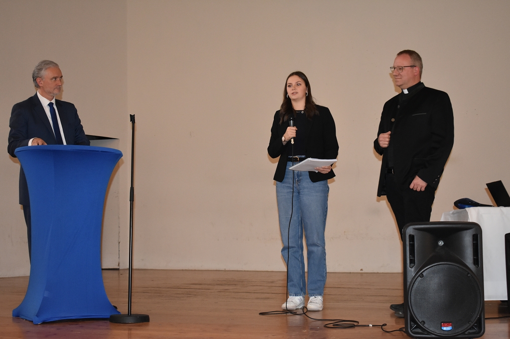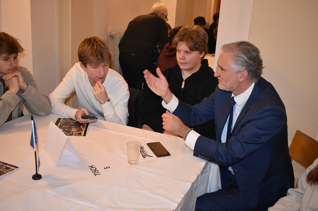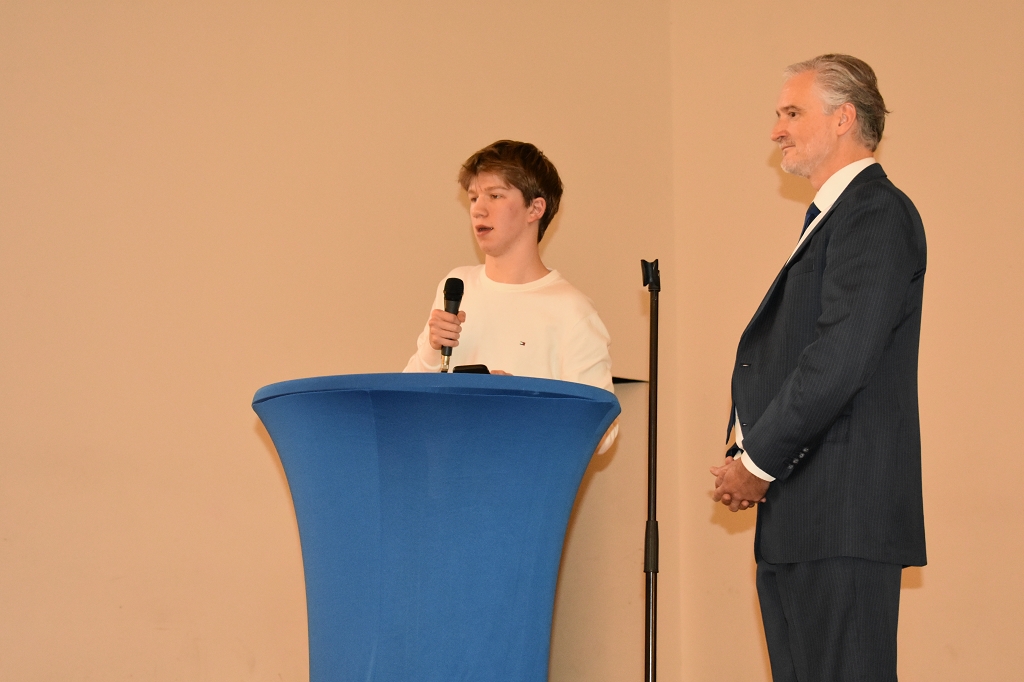 Nach der Europahymne, intoniert vom Bläserquartett der Schule (Andreas Streit 8b, Tobias Streit 5b, Elias Zweytick 7b, Clemens Hinteregger 4b) unter der Leitung von Prof. Thomas Zdravja, eröffnete die Direktorin Mag. Ines Leschirnig-Reichel die Veranstaltung. Im Anschluss an die Grußworte von Bürgermeister Stefan Salzmann und Dr. Christian Gsodam, Europäischer Diplomatischer Dienst, folgte die Videobotschaft des LH Dr. Peter Kaiser. In dieser unterstrich er die Wichtigkeit der europäischen Grundwerte, vor allem der Bildung, und zeigte sich hocherfreut über das Interesse der Jugendlichen an der Thematik.