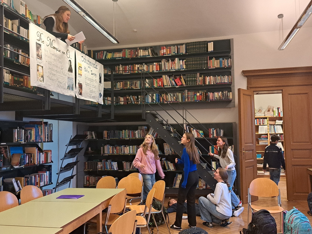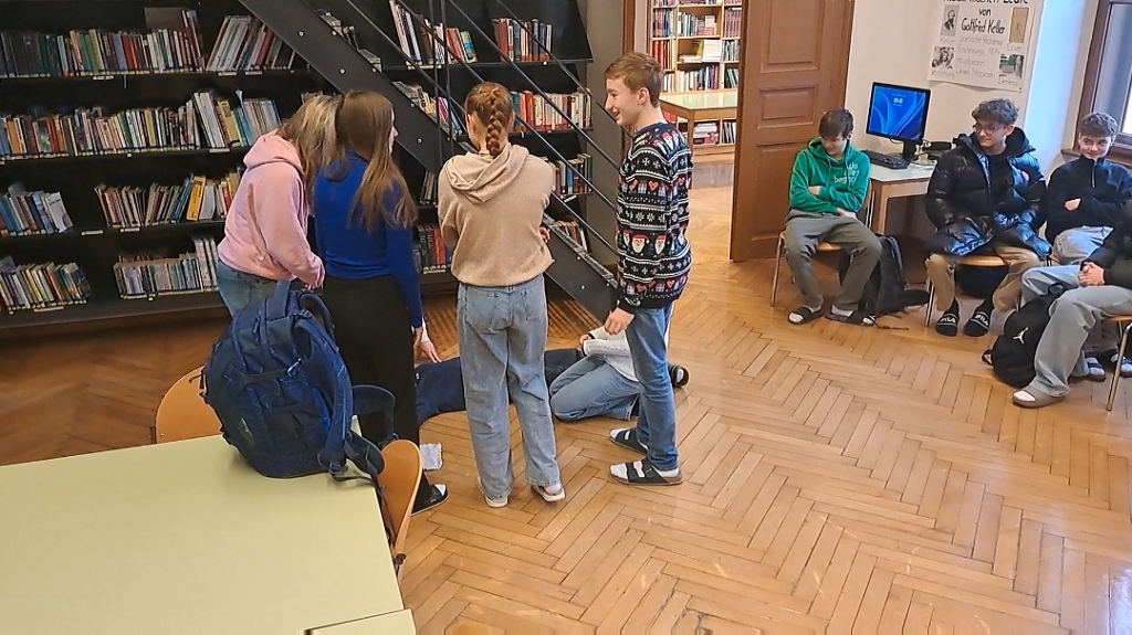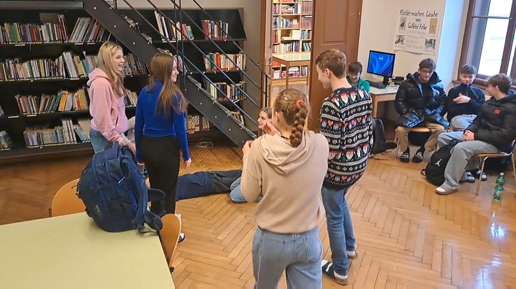 Gemeinsam setzten sie sich an ihre Tische, griffen zu Stift und Papier und entwickelten kreativ ihre eigenen Ideen. Was war mit dem Bibliothekar passiert? Warum lag er da? Mit viel Fantasie und Teamarbeit entstanden die wildesten Theorien. Doch die Klasse war nicht nur als Geschichtenerzähler gefragt, sondern auch als Schauspieler: Am Ende der Stunde führten die Schüler:innen die von ihnen entwickelte Geschichte auf und schlüpften in die Rollen der verschiedenen Charaktere.