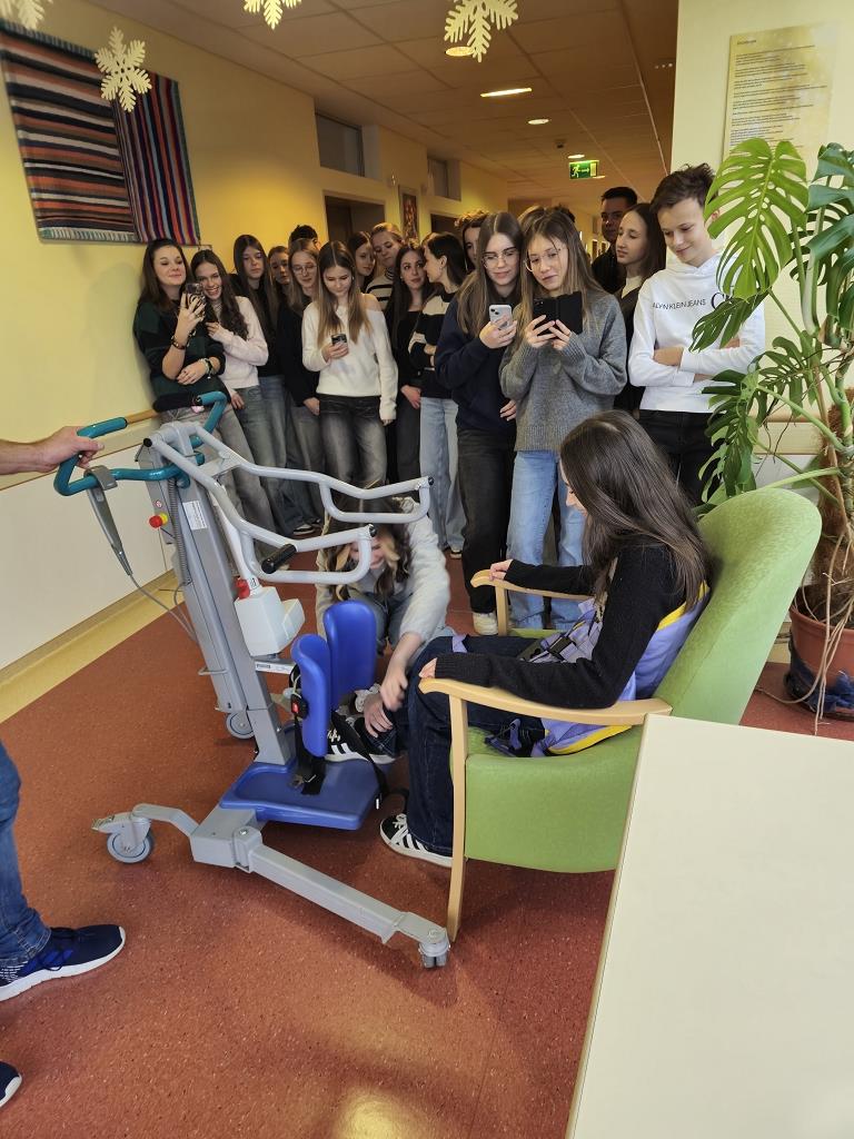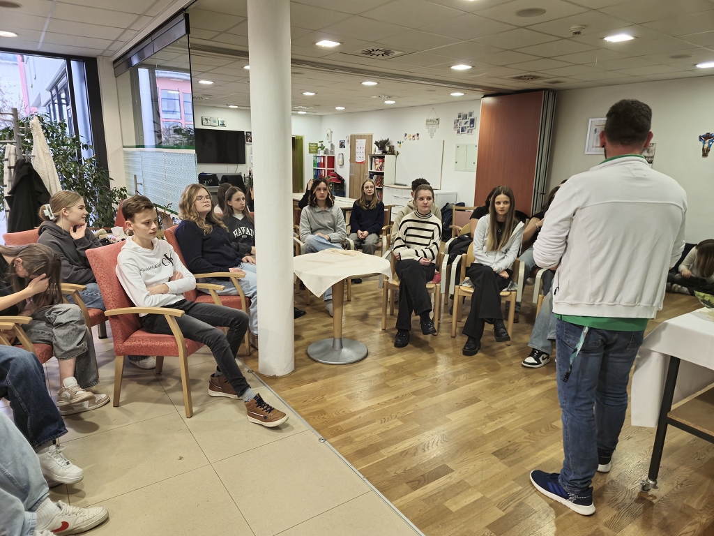 Die Exkursion begann mit einer Führung durch das Gebäude, bei der wir ausführlich über den Beruf der Pflegehelfer:in informiert wurden. Es wurden uns verschiedene Hilfsmittel gezeigt, wie man Menschen, die nicht mehr so mobil sind, gut betreuen kann. Anschließend hatten wir die Möglichkeit, bei Speis und Trank, Fragen zu stellen. Nach dem Mittagessen der Bewohner:innen, wurden sie von uns mit Gesang und Unterhaltungen bei Laune gehalten. Außerdem hatten wir die Erlaubnis, die Reste des Benefizmarktes an die Bewohner:innen zu verschenken. Während der Unterhaltung bekam jeder Schüler/jede Schülerin ein von den Senior:innen selbst gebasteltes Geschenk.