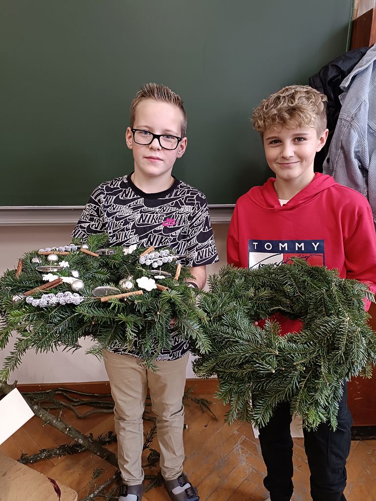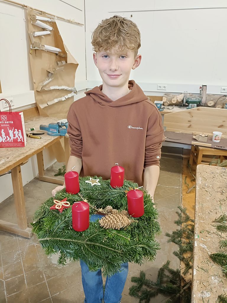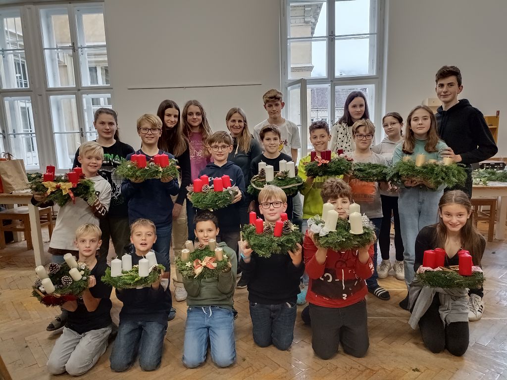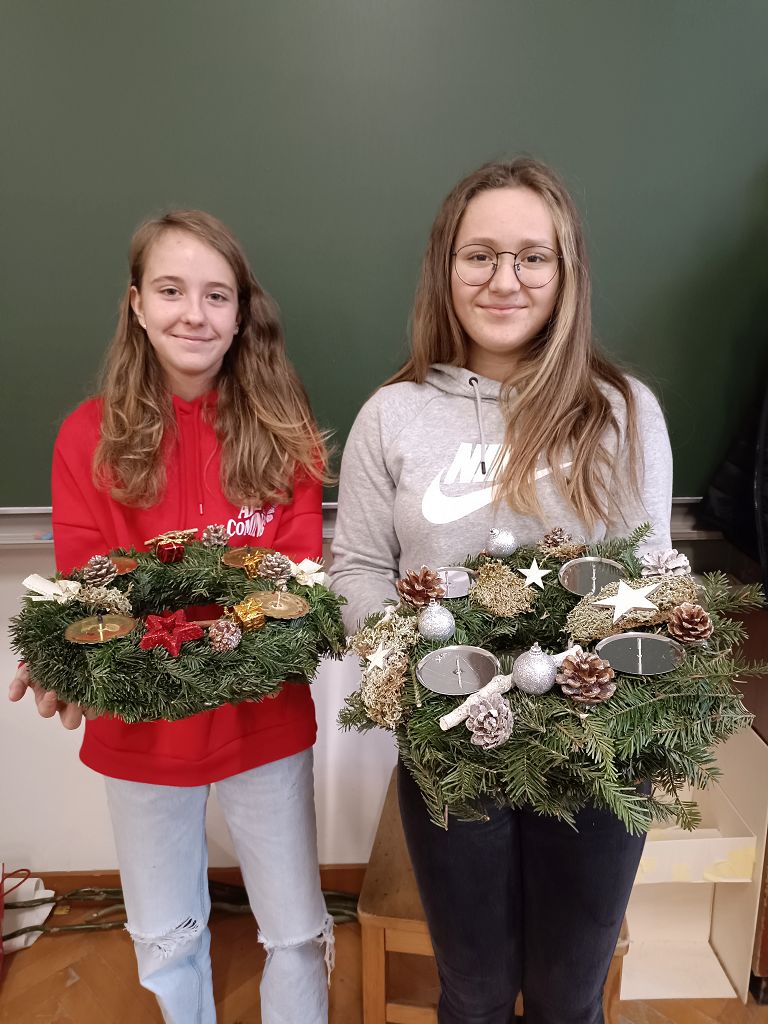 Besonders hervorzuheben ist, dass einige SchülerInnen sich der herausfordernden Aufgabe stellten, die riesigen Adventkränze für die Schule anzufertigen.