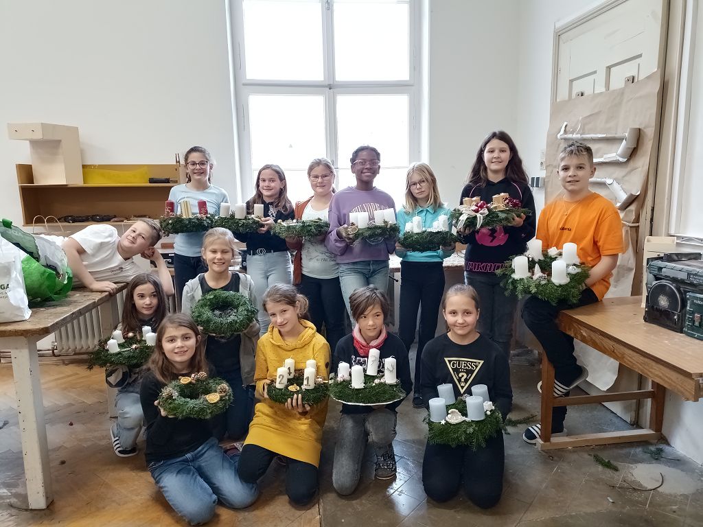 Mit großer Begeisterung fertigten die SchülerInnen wunderschöne Adventkränze an. Den Jüngeren standen die Älteren mit Rat und Tat zur Seite. Besonders erwähnenswert ist, dass auch einige Geschwisterpaare klassenübergreifend gemeinsam gearbeitet haben. Beim Dekorieren waren der Fantasie keine Grenzen gesetzt.