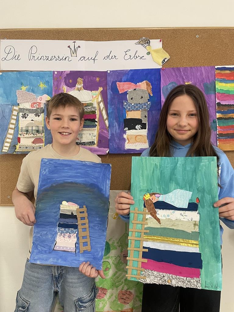 Einige Schüler:innen beschäftigten sich sogar noch in ihrer Freizeit mit dem Thema. Manche brachten ihre eigenen Märchenbücher und Figuren als Vorlage mit, andere bereiteten freiwillig ein Referat sowie ein Quiz zur Prinzessin auf der Erbse für ihre Mitschüler:innen vor. In diesem Zusammenhang konnte mit den Schüler:innen noch einmal die Moral der Geschichte besprochen werden: „Beurteile andere nicht nach den falschen Dingen“. Ein Satz, welcher in unserer von Social Media und Fake News dominierten Welt vielleicht wichtiger ist denn je. Die Prinzessin auf der Erbse ist ein Märchen über Authentizität und wahre Werte, denn der Prinz hat Schwierigkeiten darin, eine richtige Prinzessin zu erkennen, und die Königin zweifelt an der Echtheit der vom Regen durchnässten Fremden. Der Test der Erbse wird zum Symbol dafür, dass wahre Werte oft erst durch ungewöhnliche Prüfungen erkannt werden können. Durch die Erbse zeigt sich die Empfindsamkeit der Prinzessin, welche die Echtheit und die Feinheit ihres Charakters symbolisiert.