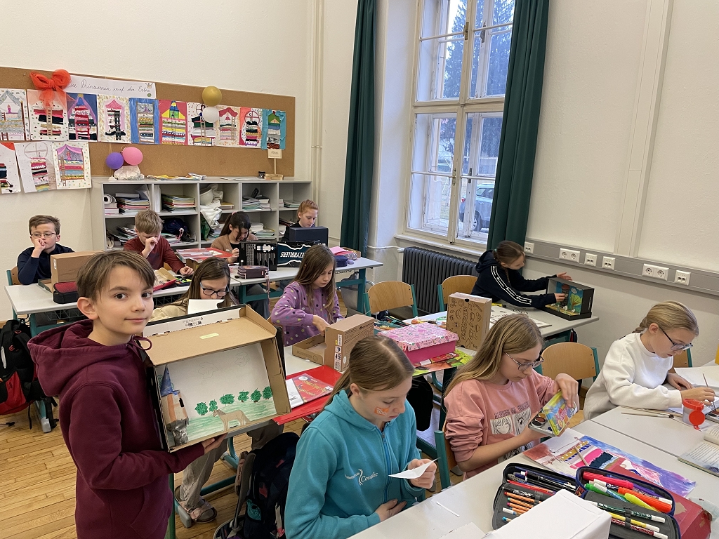Anschließend wurde das Märchen mithilfe von Mixed Media bildnerisch umgesetzt. Bei dieser Technik werden verschiedene Materialien auf dem gleichen Malgrund verwendet. Die Kinder malten das Bett mit der schlafenden Prinzessin auf ein Zeichenblatt und beklebten es mit Stoffstücken, Pappe und einer echten Erbse. Besonders für die Buben war es zuerst befremdlich, alte Kleidung und Stoffreste zerschneiden zu dürfen. Als die erste Scheu verflogen war, wurde nach Lust und Laune ausgeschnitten, geklebt und gemalt. Schließlich wurden die fertigen Bilder in den jeweiligen Klassen bzw. im Kunstsaal ausgestellt. Als Abschluss des Märchenprojektes durften die Schüler:innen noch ein Diorama in einer Schuhschachtel basteln. Sie waren in der Wahl der Materialien völlig frei und konnten eine Szene aus ihrem Lieblingsmärchen dreidimensional darstellen. Hier waren besonders räumliche Vorstellungskraft und logisches Denken gefragt, denn Türme und Brunnen sowie Schlösser und Torbögen aus Papier und Pappe mussten gebastelt und befestigt werden.