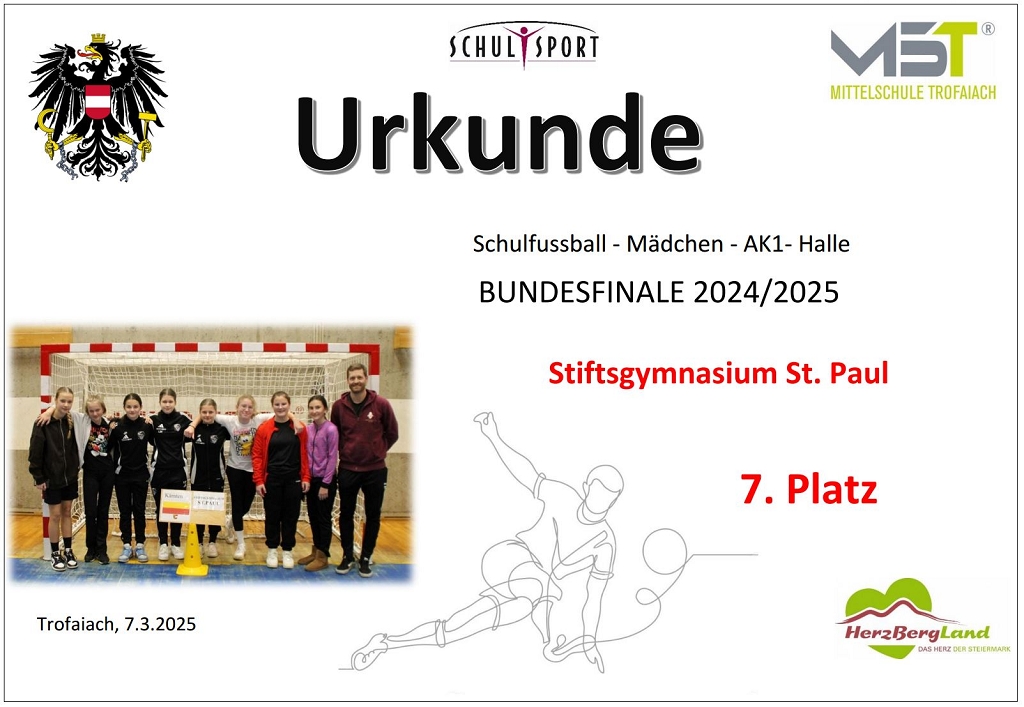 Nach dem Landesmeistertitel durften die Mädchen der Unterstufe – bestehend aus Lea Markut (4d), Hannah Ehrenberger, Johanna Pinter, Emma Reinisch, Annigreth Riegler (alle 3c), Johanna Faullant (3b), Victoria Markut (3a) und Lea Hobel (2a) – an den Futsal-Bundesmeisterschaften im steirischen Trofaiach teilnehmen und sich gegen die besten Teams aus ganz Österreich beweisen.