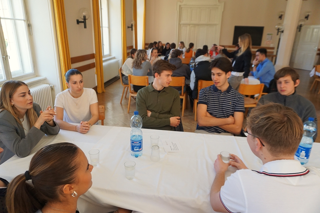 Nach einer herzlichen Begrüßung seitens der Direktorin übernahmen diese die Vorstellung ihrer Person gleich selbst und begaben sich danach an die für ihre jeweiligen Studien vorgesehenen Tische. So konnten sich, wie bei einer Studienmesse, alle Septimaner:innen Informationen und Ezzes aus erster Hand holen. Auch Themen wie ÖH, Zivildienst / Bundesheer, Auslandsaufenthalt nach der Matura oder studentische Mitarbeit am Institut konnten nachgefragt werden.