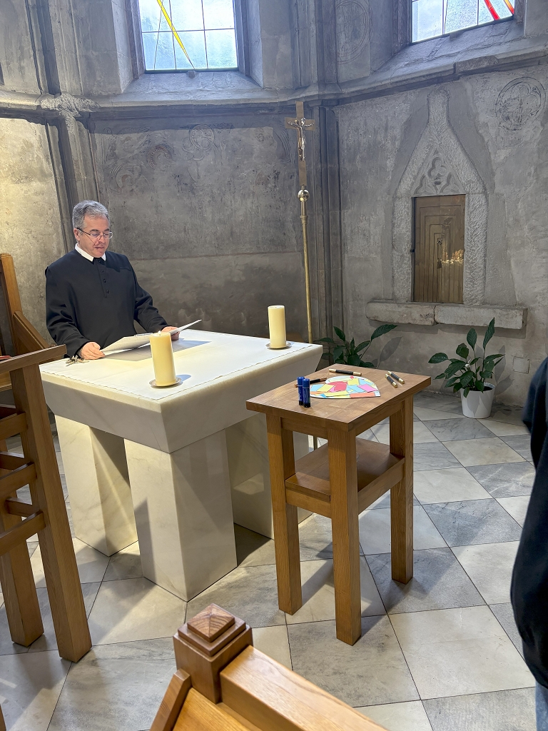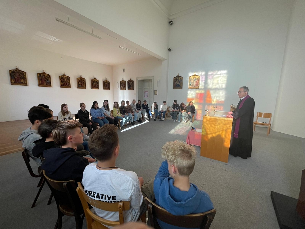 Mit den Schülerinnen und Schülern der Unterstufe feierte im Lauf der Fastenzeit Dechant Kons. Rat P. Dr. Gerfried Sitar OSB im jeweiligen Klassenverband eine gemeinsame Bußliturgie. In deren Zentrum stand das Herz, welches, durch die verschiedenen Widernisse der Jahre so seine Sprünge und Kratzer hat, welche symbolisch auf ein gemeinsames Herz der Klasse geklebt und anschließend, der japanischen Kunst des Kintsugi folgend, die Sprünge mit Gold(farbe) an ihren Bruchstellen wieder geeint wurden.