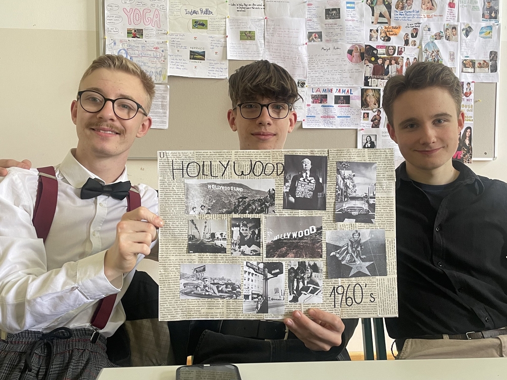 Inspired by the movie, we created 1960s-themed mood boards, which are compilations of small, printed images and quotes to convey a general idea or feeling about a topic. On April 23rd, the finished mood boards were finally presented to the entire group. Thanks to Domenik Hochegger, 7a, the presentations felt more like conversations, because he had brought croissants for all of us, so that we could have breakfast as in the movie. We all enjoyed the cozy atmosphere of this morning. Moreover, everybody wore an outfit inspired by the 1960s. The girls had put on miniskirts and headbands; the boys wore leather jackets or had borrowed their fathers’ and grandfathers’ suits. Finally, a class photo from 1965 was faked for fun.