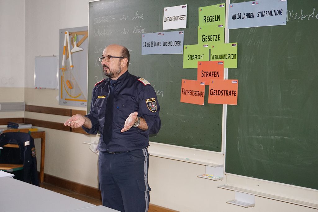 Während die 3. Klassen das Jugendschutzgesetz kennenlernten, präsentierte BezInsp. Johann Berger den Jugendlichen der 4. Klassen das Jugendstrafrecht. Sie analysierten gemeinsam ein Beispielvideo und diskutierten darüber, was es bedeutet, strafmündig zu sein und Zivilcourage zu beweisen.