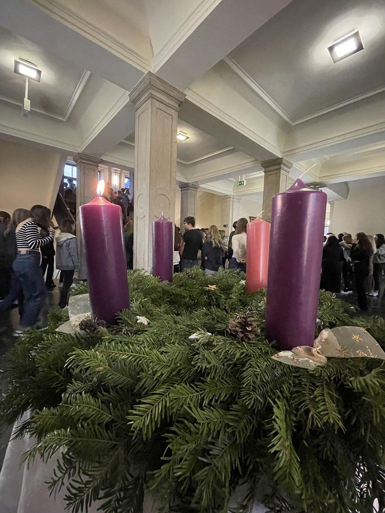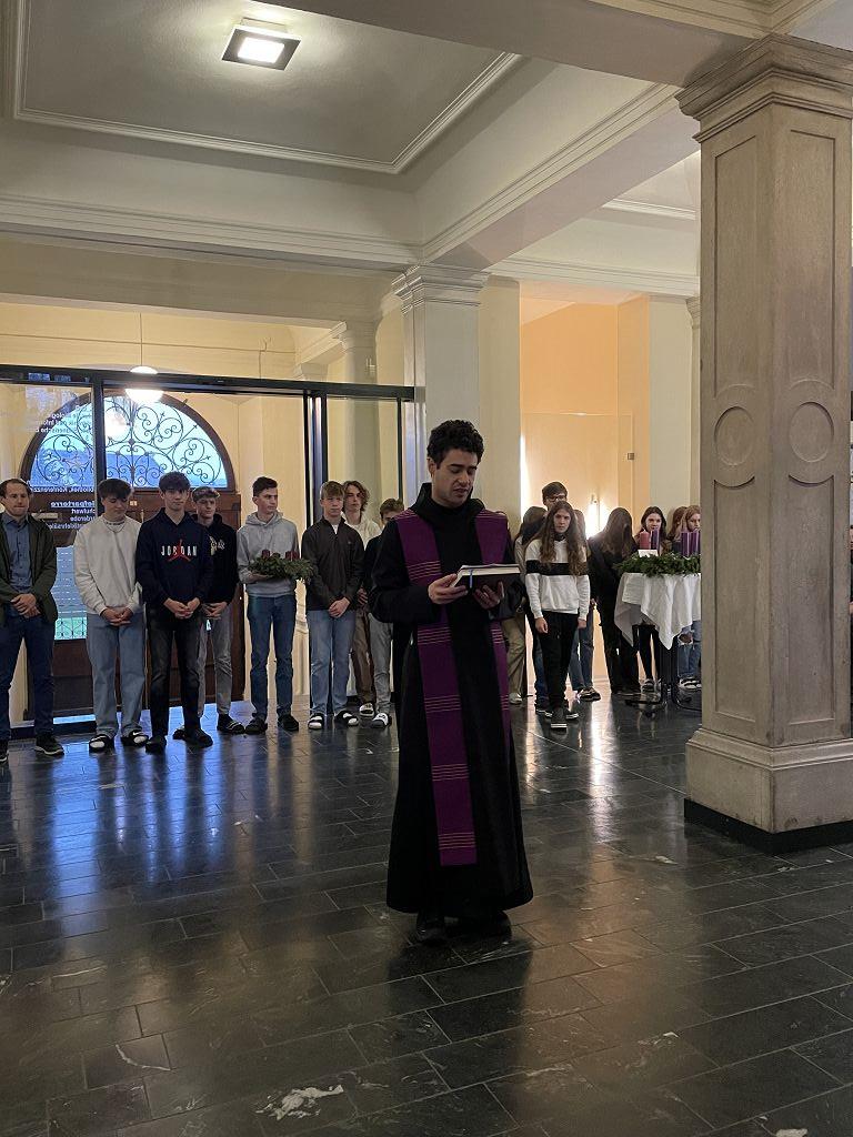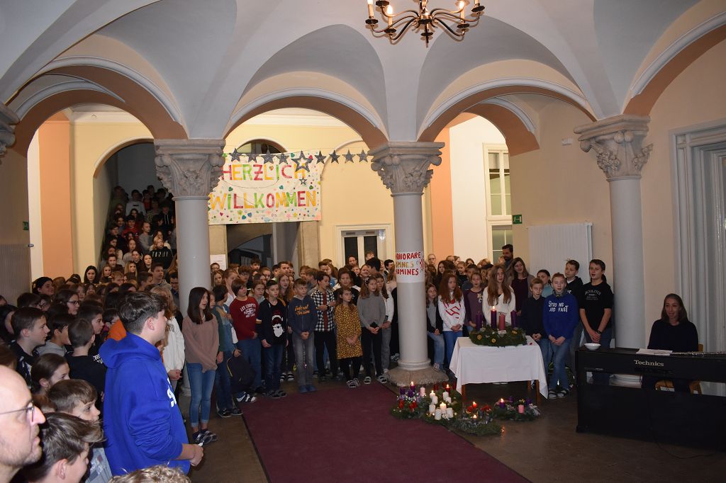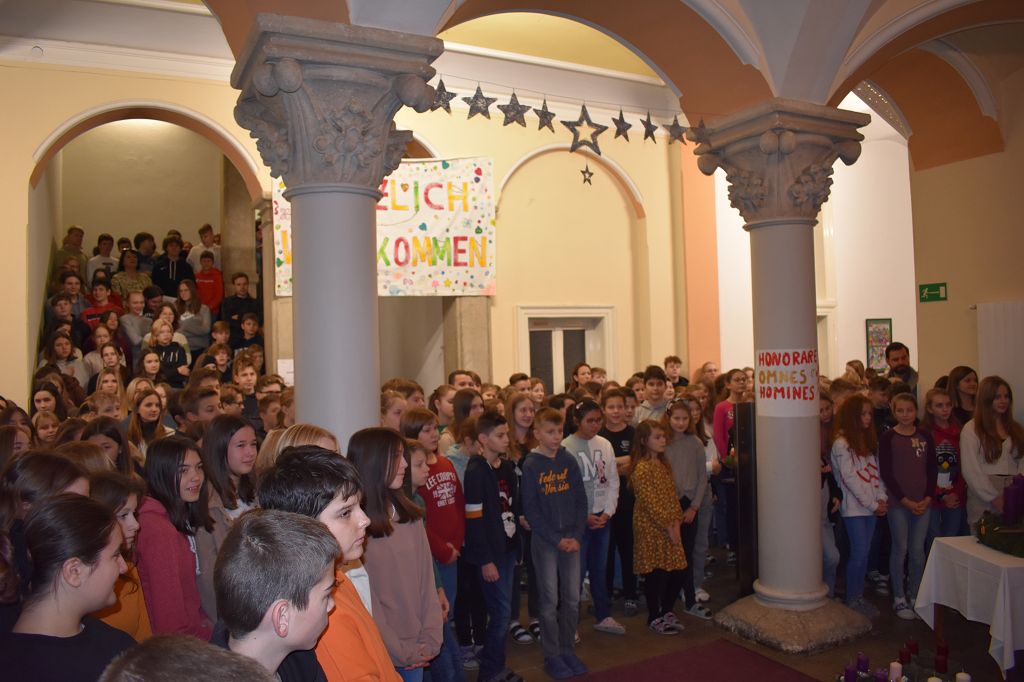 Stiftsadministrator Mag. Pater Marian Kollmann OSB und Frater Romanus Kriebernegg OSB aus dem Konvent leiteten mit andächtigen Worten den Advent und somit die Ankunft Christi ein. Die Gedanken der Nächstenliebe und des Friedens sollen uns in dieser Zeit begleiten, aber auch während des restlichen Jahres gelebt werden. Die Zeremonien im Konvikt und Gymnasium wurden vom Schulchor unter der Leitung von Mag. Almut Wakonig-Dalton und Thomas Zdravja stimmungsvoll umrahmt. Nach der Lesung und den Fürbitten, die von den Schülerinnen und Schülern vorgetragen wurden, erfolgte die Segnung der Kränze und das Entzünden der ersten Kerze.