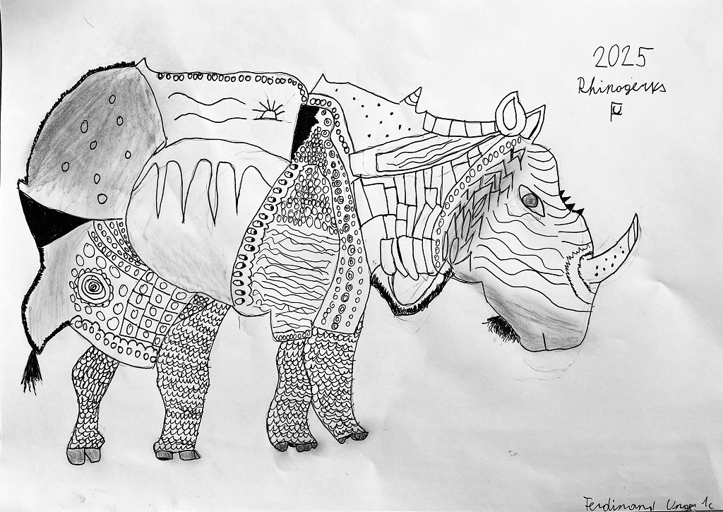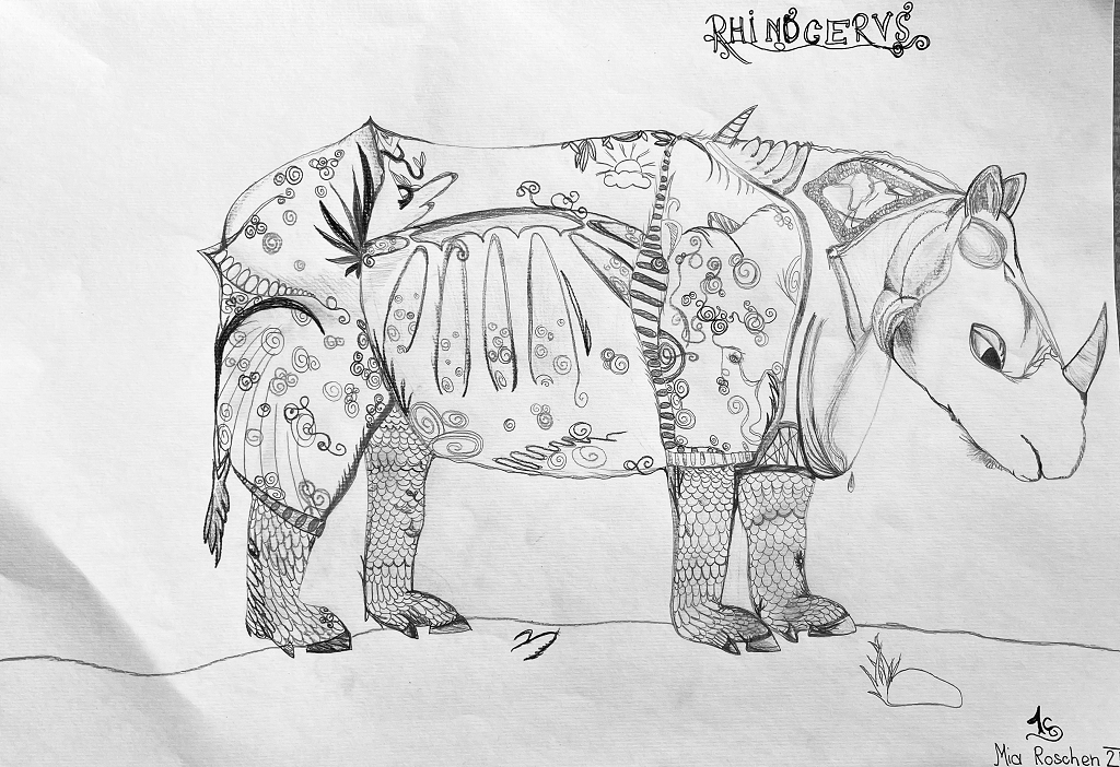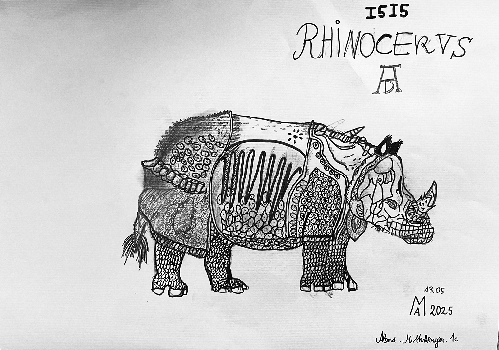 Unsere Schüler: innen nahmen dies zum Anlass, um das Bild zunächst zu analysieren und darauf zu achten, wie der Künstler ein Tier dargestellt hat, das er nicht kannte und welche fantasievollen Elemente er hat einfließen lassen. Später zeichneten sie ihre eigenen Versionen des ikonischen Dürer Nashorns. Der Schwerpunkt lag dabei auf fantasiereichen Mustern und unterschiedlichen Linienformen.