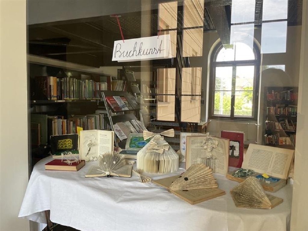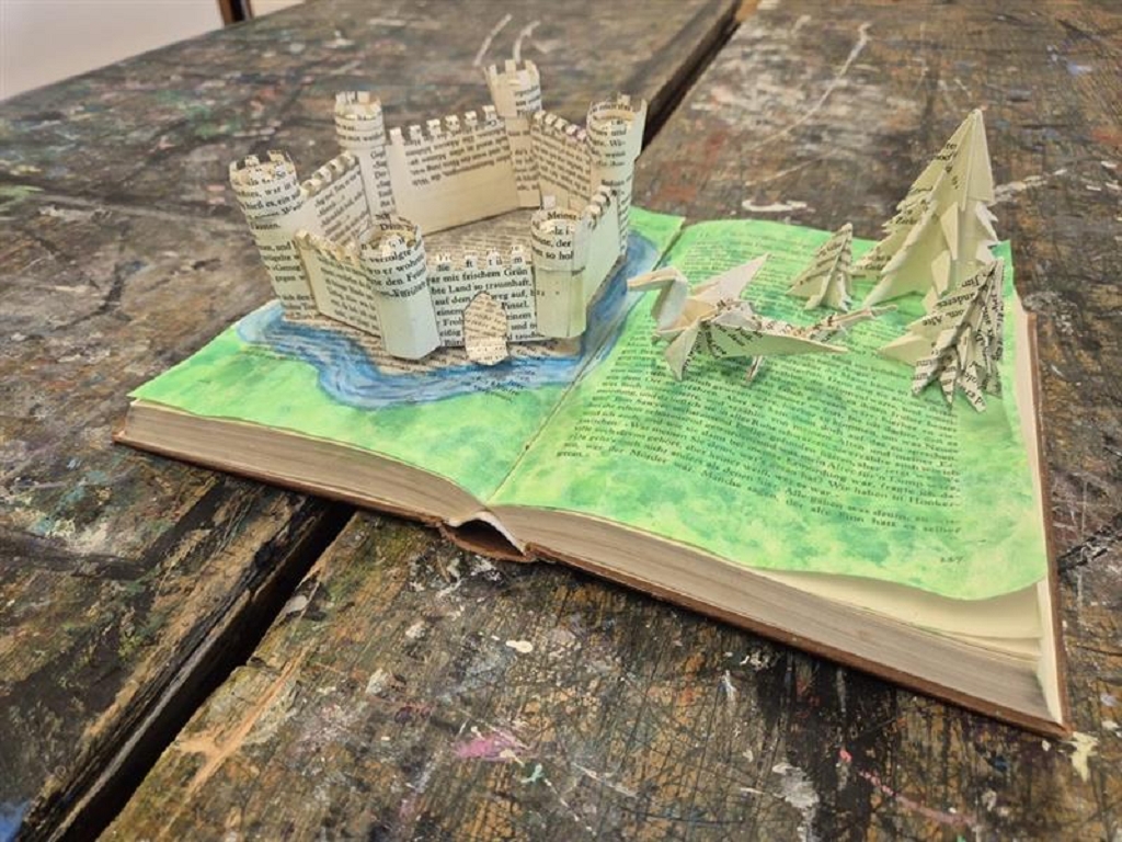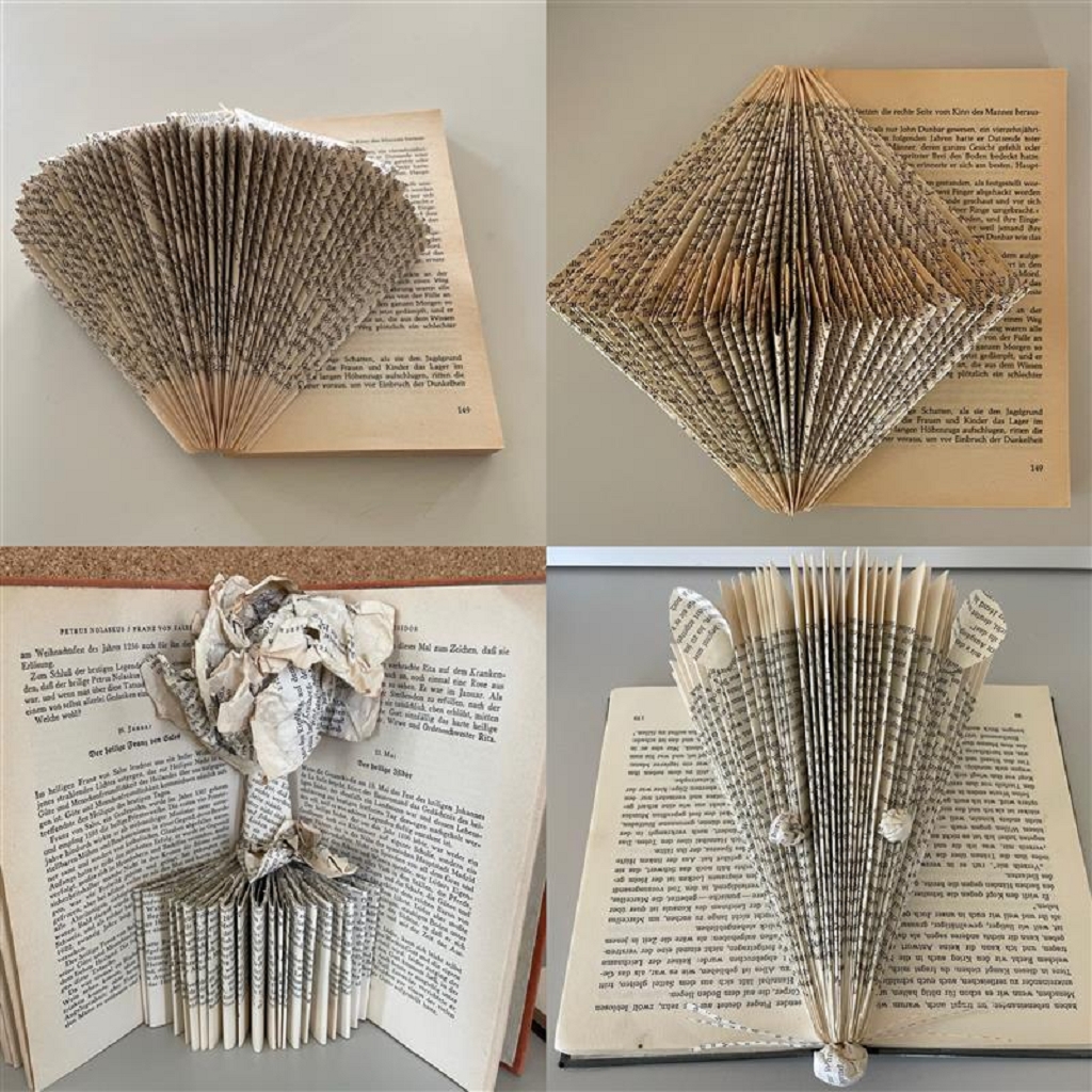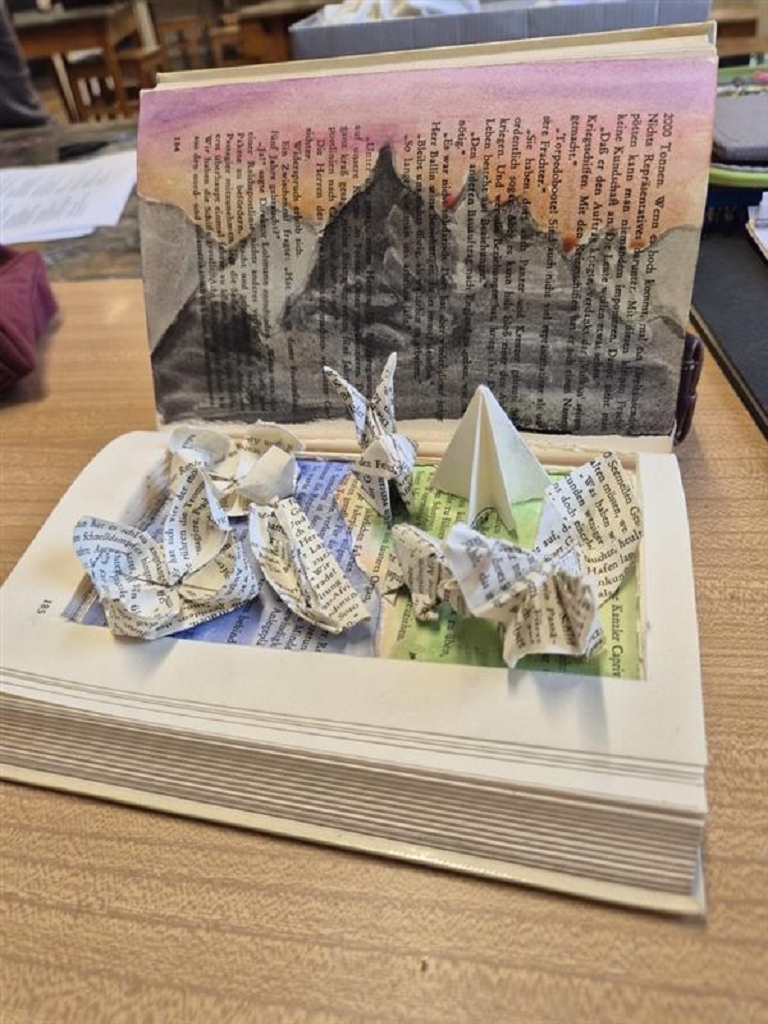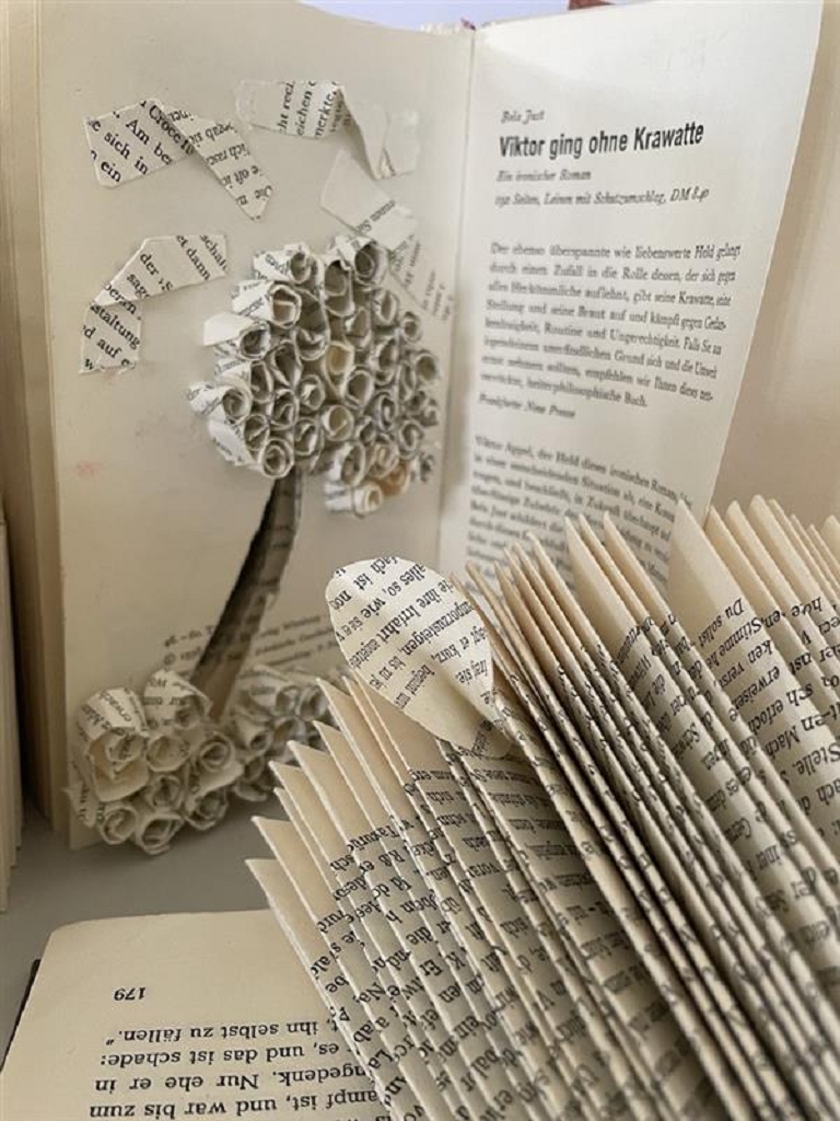 Die Schüler:innen der 7. Klassen des Stiftsgymnasiums verwandelten alte Bücher in Kunstwerke.