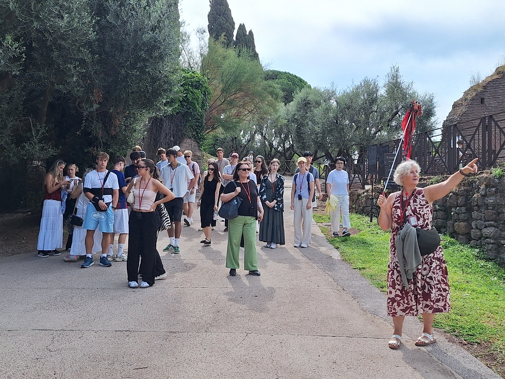 Ein Tagesausflug nach Pompeji (Nähe Neapel) lieferte eindrucksvolle Bilder einer römischen Provinzstadt, die durch den Vesuvausbruch (79 n.Chr.) großteils verschüttet, jetzt teilweise ausgegraben, einen wunderbaren Blick in das antike Alltagsleben bietet, eine Vorstellung von dem gibt, wie alltägliche Abläufe in allen Lebensbereichen stattgefunden haben. Auf der Rückfahrt nach Rom war es für die Maturant:innen eine Herzensangelegenheit, dem Mutterkloster aller Benediktinerklöster, Monte Cassino, einen Besuch abzustatten.