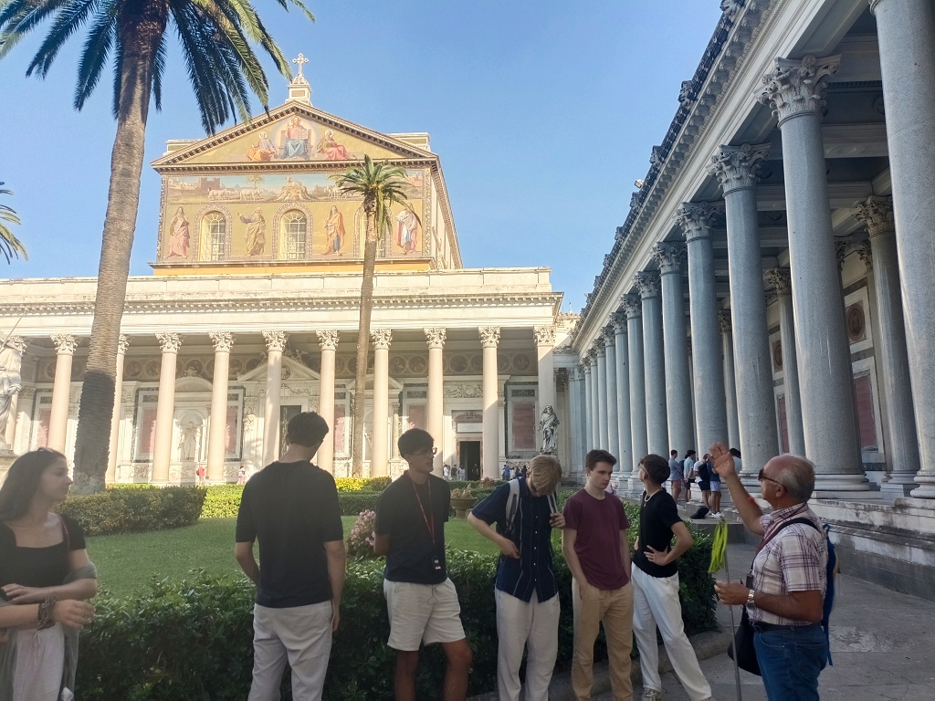 Dass aufgrund des „Heiligen Jahres – 2025“ mehr als sonst Besucher vor Ort sein würden, war eine Befürchtung aller, hat sich aber nicht unbedingt bestätigt. Natürlich war das Touristenaufkommen, v.a. in den Papstbasiliken, höher, aber nicht überbordend. So waren die Besuche im Petersdom, in der Lateranbasilika und natürlich in der von Benediktinern betreuten Basilika San Paolo fuori le mura eindrucksvolle Erlebnisse, hat man doch nur alle 25 Jahre die Möglichkeit, die jeweilige „Porta Santa“ der Kirchen zu durchschreiten. Ein höchst interessanter Gang durch die Katakomben des Hl. Sebastian rundete das Bild des christlichen Roms für alle ab. Das absolute Highlight für die Schüler:innen war aber - nach erfolgter Evaluation - die Papstaudienz, die jeden Mittwoch am Petersplatz durchgeführt wird und heuer in sehr hohem Maße von den Besuchern in Anspruch genommen worden war. Selten war der Platz vor dem Petersdom so gefüllt, als Papst Leo XIV. durch die Mengen fuhr und voller Freundlichkeit und Offenheit die Pilger:innen begrüßte.