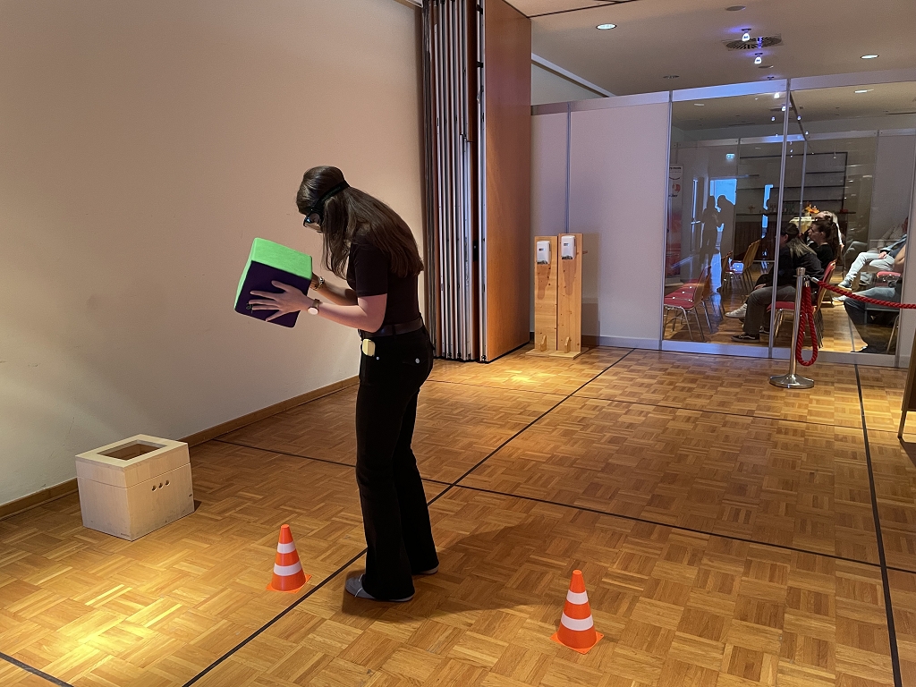 Die dritte Station befasste sich mit Alkoholismus. Durch Brillen, die verschieden starke Promillen simulierten, wurde das Sichtfeld beeinträchtigt. So mussten die Schüler:innen einen Slalom-Parcours absolvieren und einen großen Würfel in eine Box legen.