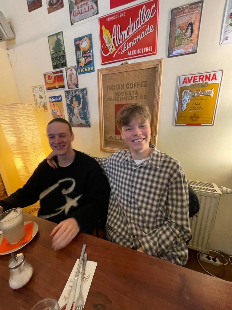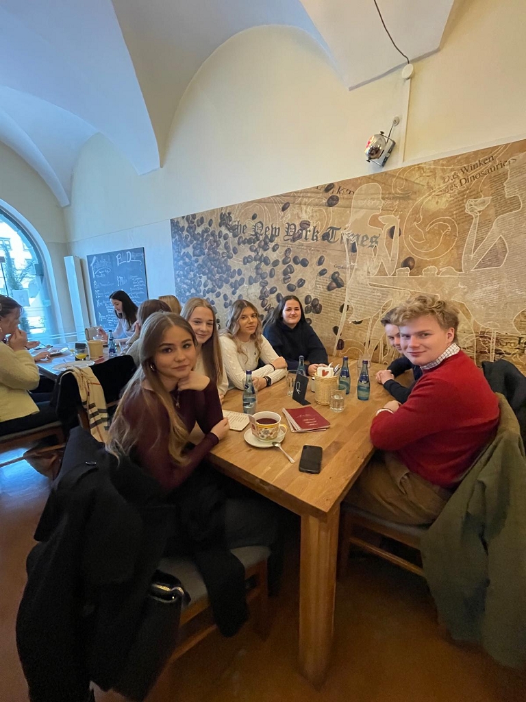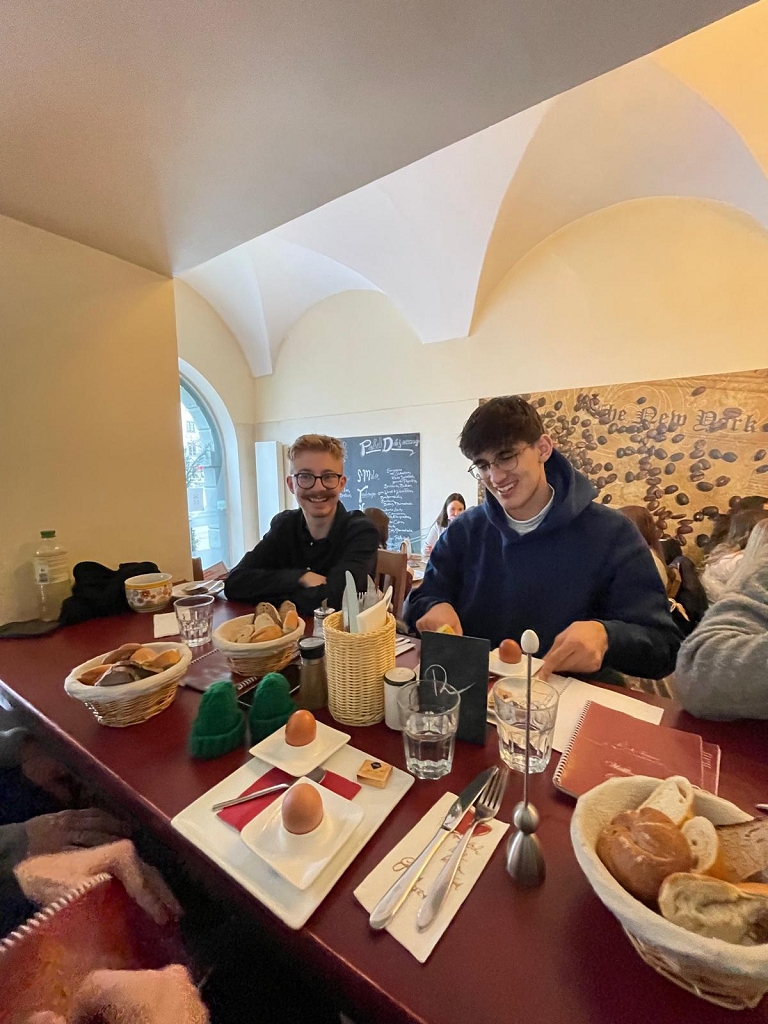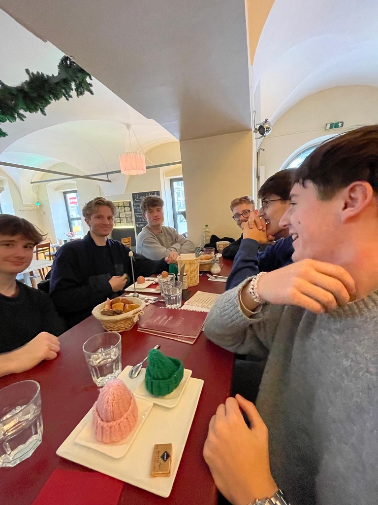 À Klagenfurt, notre assistant de langue, Lucas Roger, s’est joint au groupe, ajoutant une touche encore plus française à l’aventure. La journée a débuté dans une atmosphère chaleureuse autour d’un savoureux petit‑déjeuner au bistrot « Île de France », parfait pour se mettre dans l’ambiance.