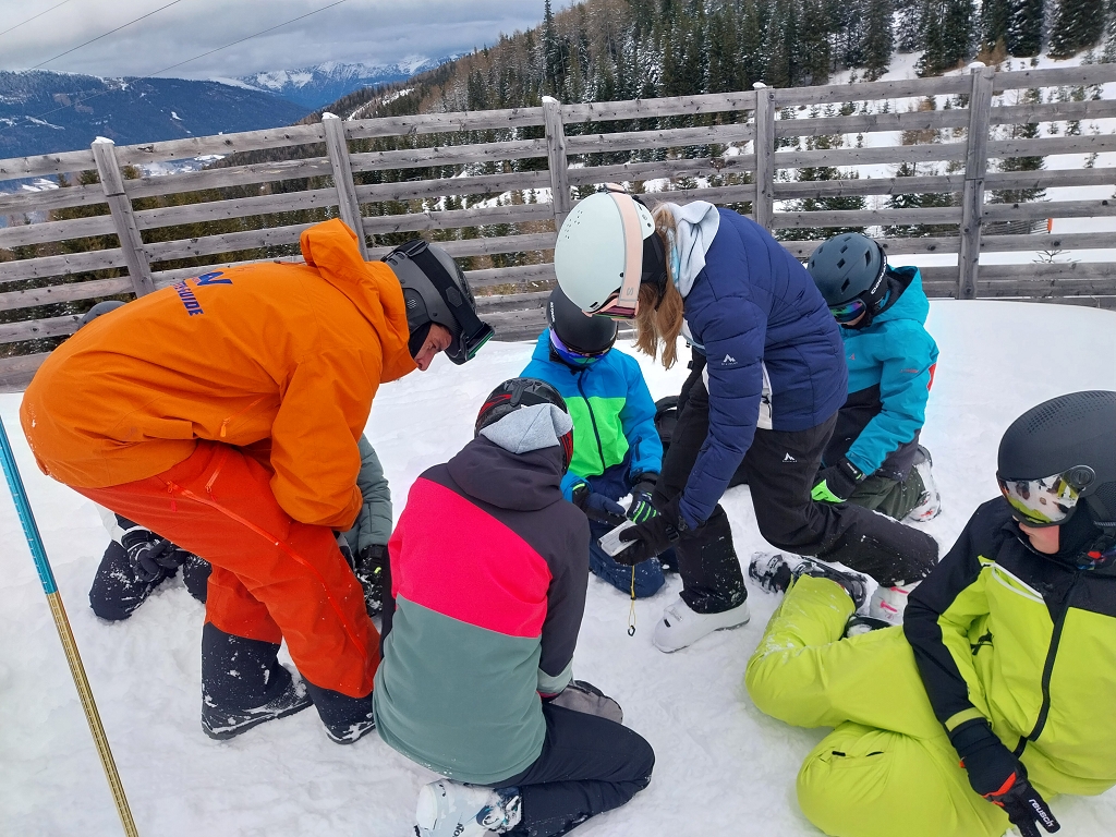 Erste Hilfe, Lawinenkunde und die Pistenregeln wurden vom AUVA-Safety-Guide mit einem interessanten abendlichen Vortrag und mit praktischen Übungen auf der Piste vermittelt.