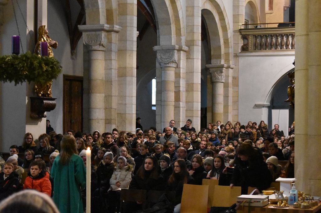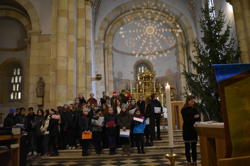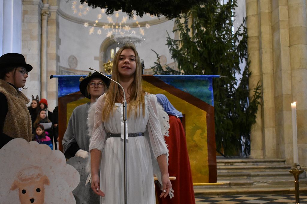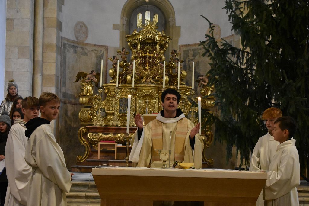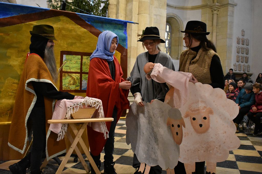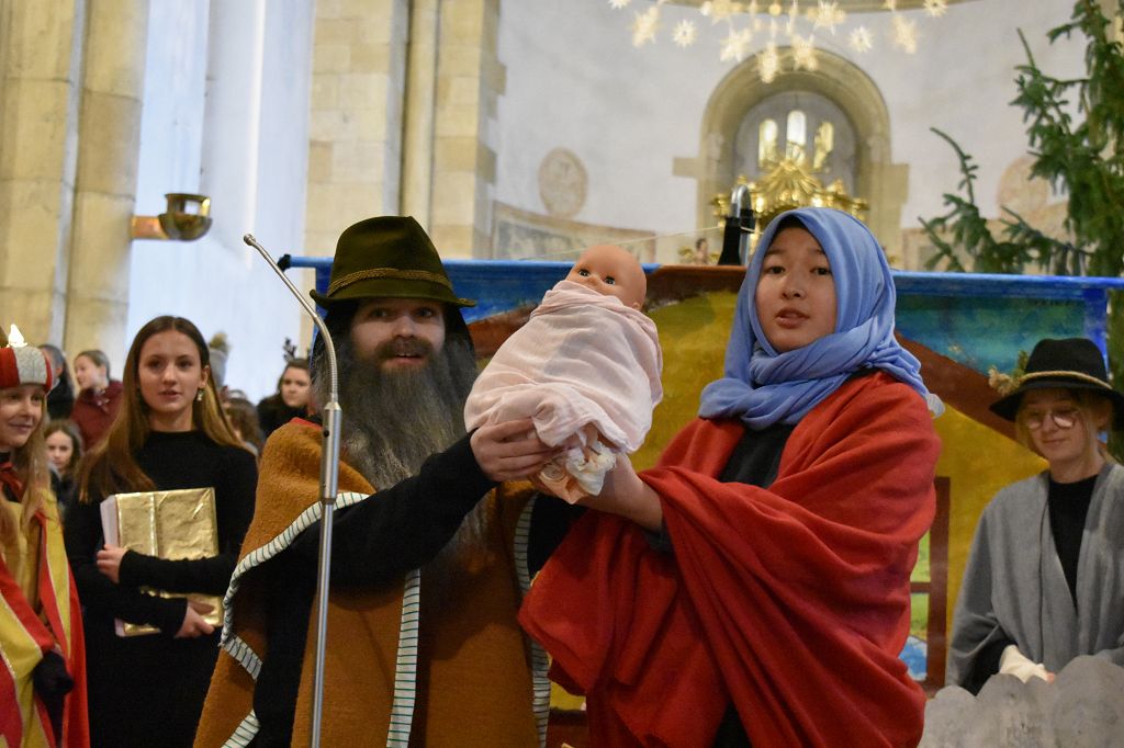 Der Schulchor unter der Leitung von Professorin Almut Wakonig-Dalton begleitete uns durch die Feier von Wort und Eucharistie und Professorin Victoria Meklin hatte, dem Evangelium folgend, mit den Schülerinnen und Schülern der Unterstufe ein Krippenspiel einstudiert, welches das Wort des Evangeliums mit großer Freude zum Leben erweckte.