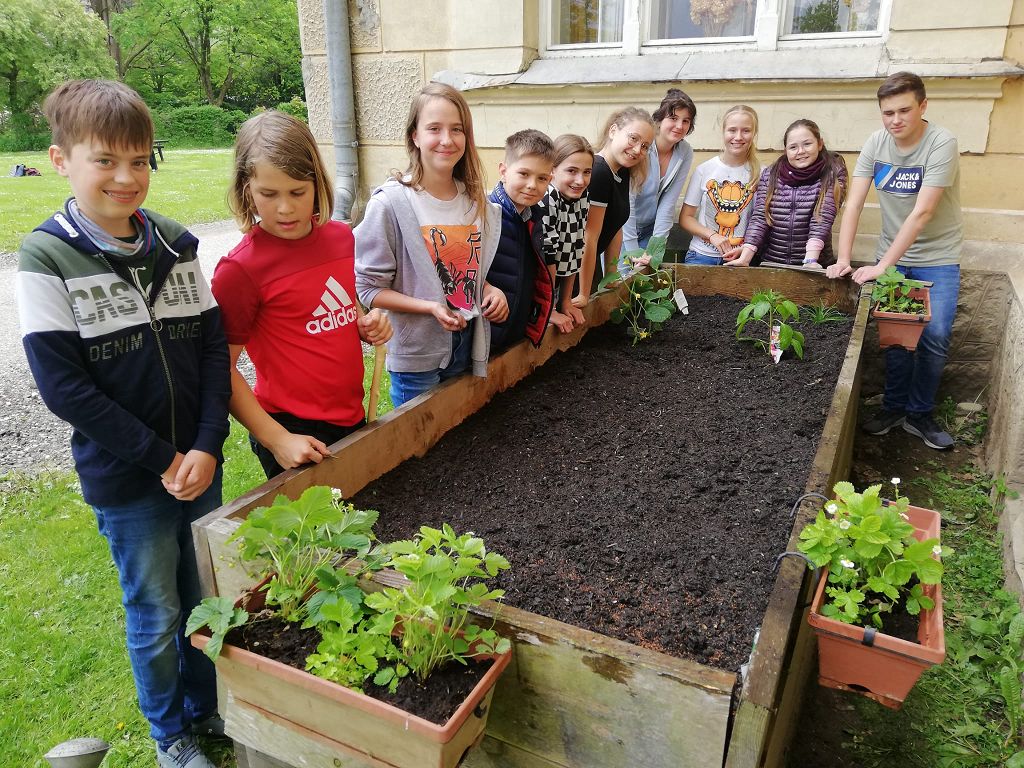 Hochmotiviert gingen die Schülerinnen und Schüler der 1a, 2a, 2b und 3a Klasse ans Werk. Die Kraft erfordernde Arbeit des Umstechens übernahmen die Burschen der 4a Klasse. Gepflanzt wurden u.a. Radieschen, Karotten, Zuckererbsen, Mini-Gurken, Paprika, Schnittlauch, Kresse und natürlich Erdbeeren.